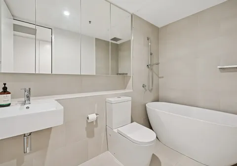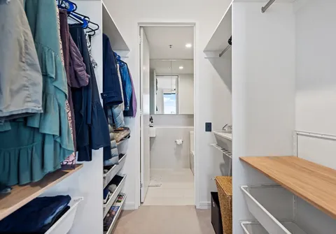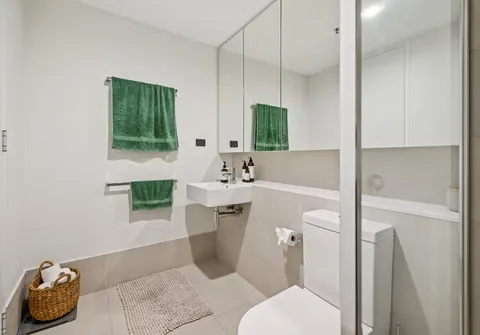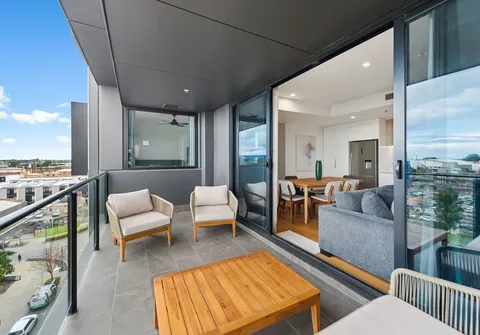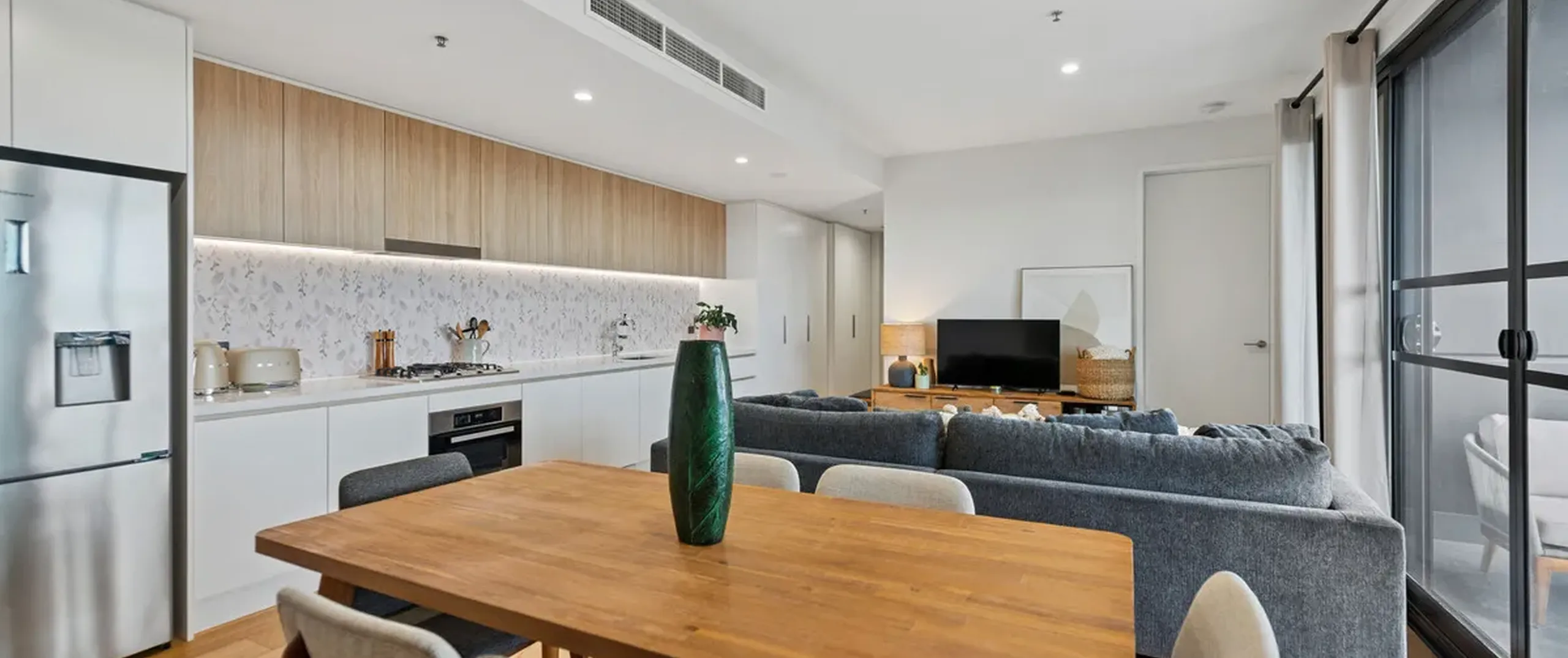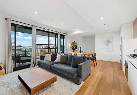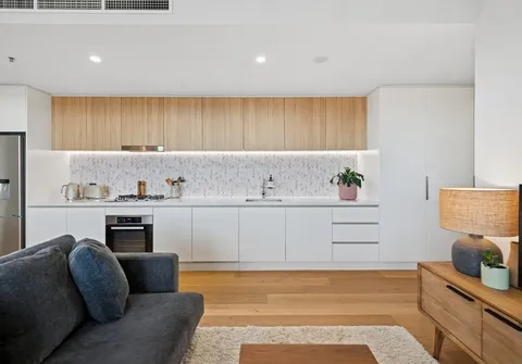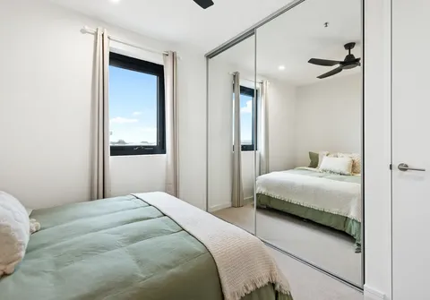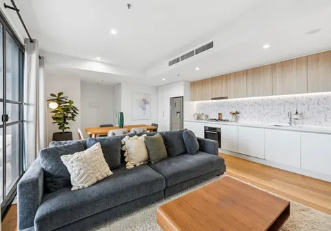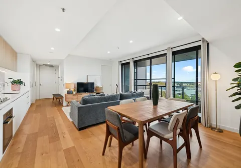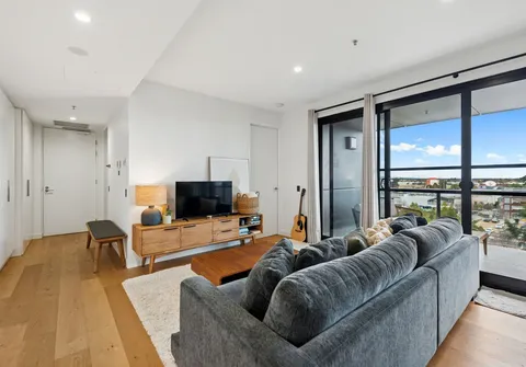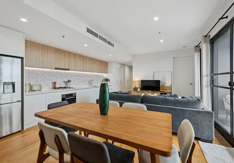 Offering two generously sized bedrooms and two pristine bathrooms, this beautifully presented residence showcases modern living at its finest. The open-plan layout combines the living, dining and kitchen areas, flowing effortlessly onto a private balcony - creating the perfect space to relax, entertain or simply unwind. High ceilings enhance the sense of space, while timber-look flooring and LED downlights throughout add warmth and contemporary style to every corner of the home.