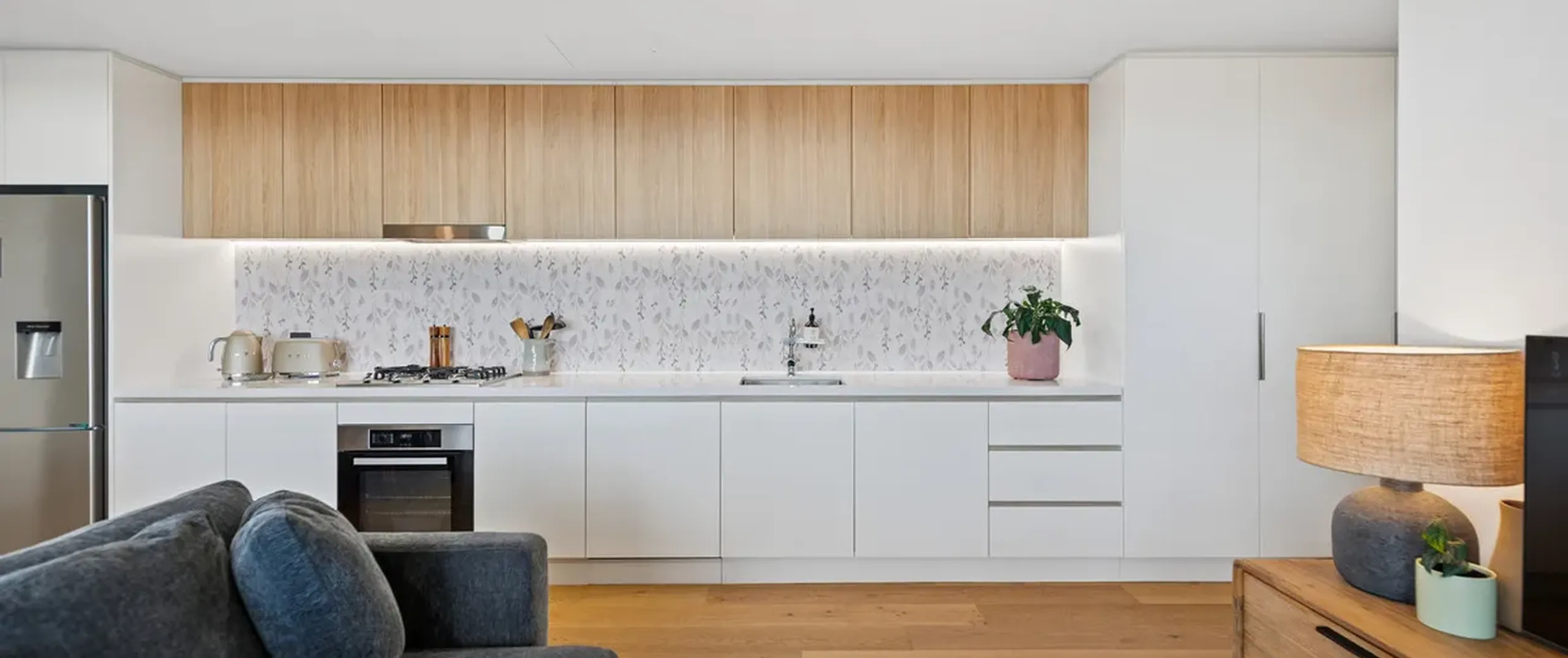 - Stylish kitchen complete with a modern splashback, LED strip lighting, integrated dishwasher, oven, cooktop and ample storage
