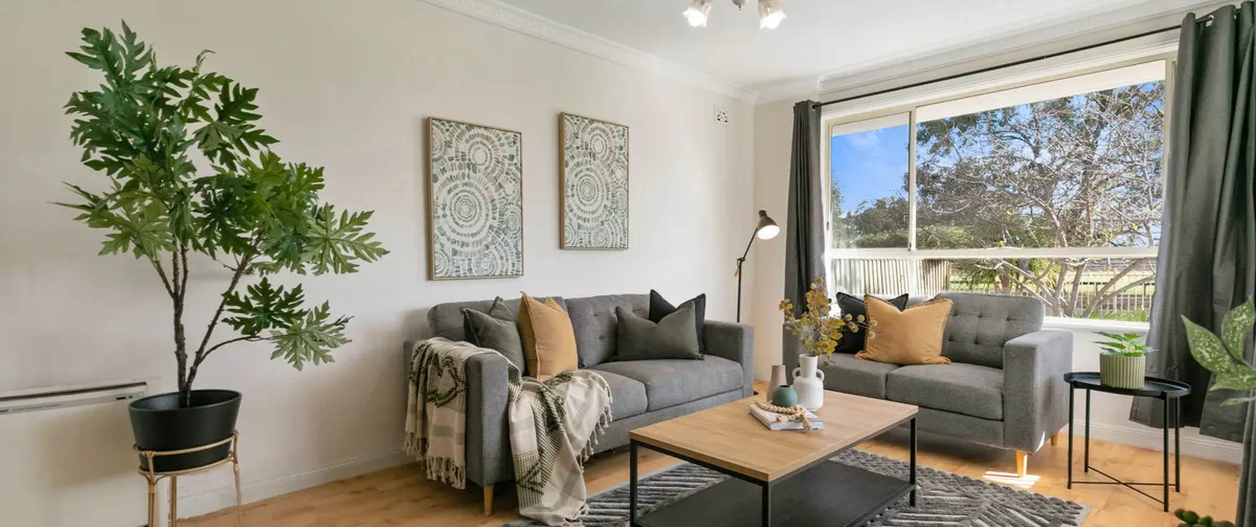 - Light filled living area adjoining the kitchen/dining, complete with gas heater and charming ornate ceiling rose