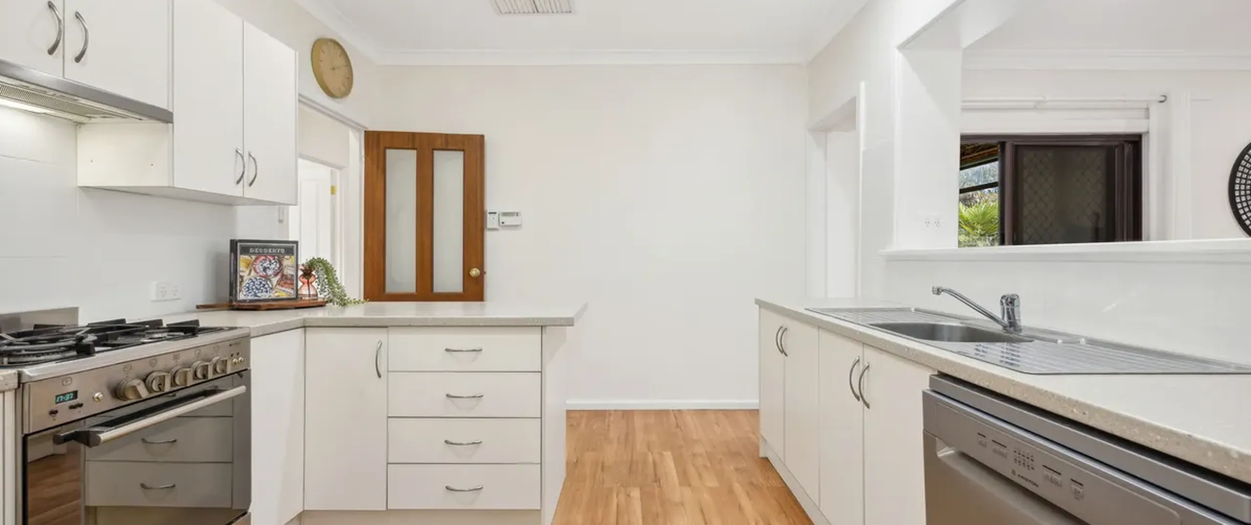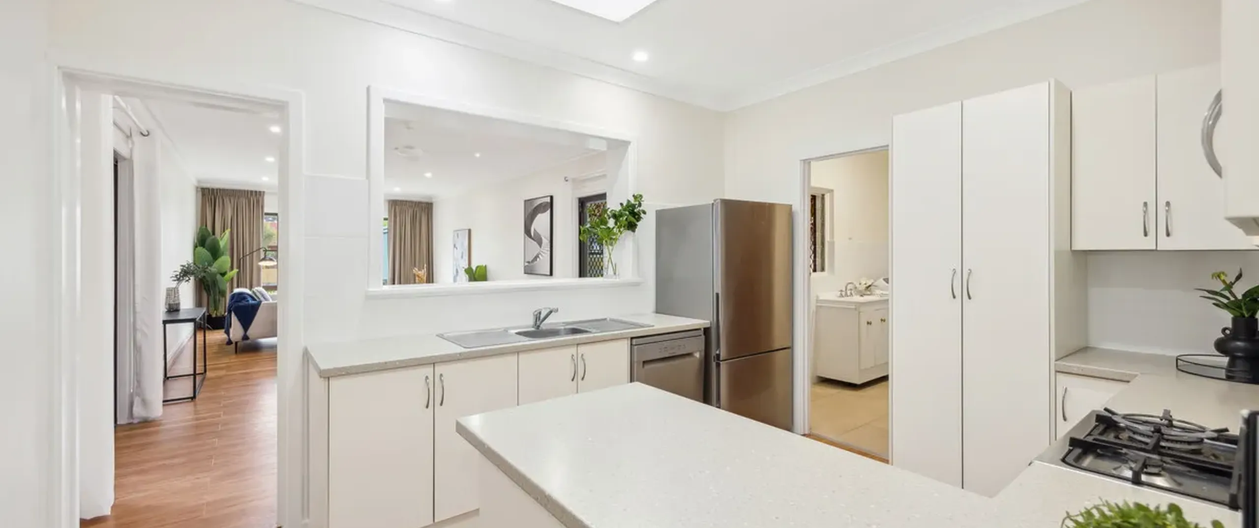 - Modern, white kitchen with stainless steel gas cooktop, dishwasher, ample bench and cupboard space, skylight and servery to living/dining room