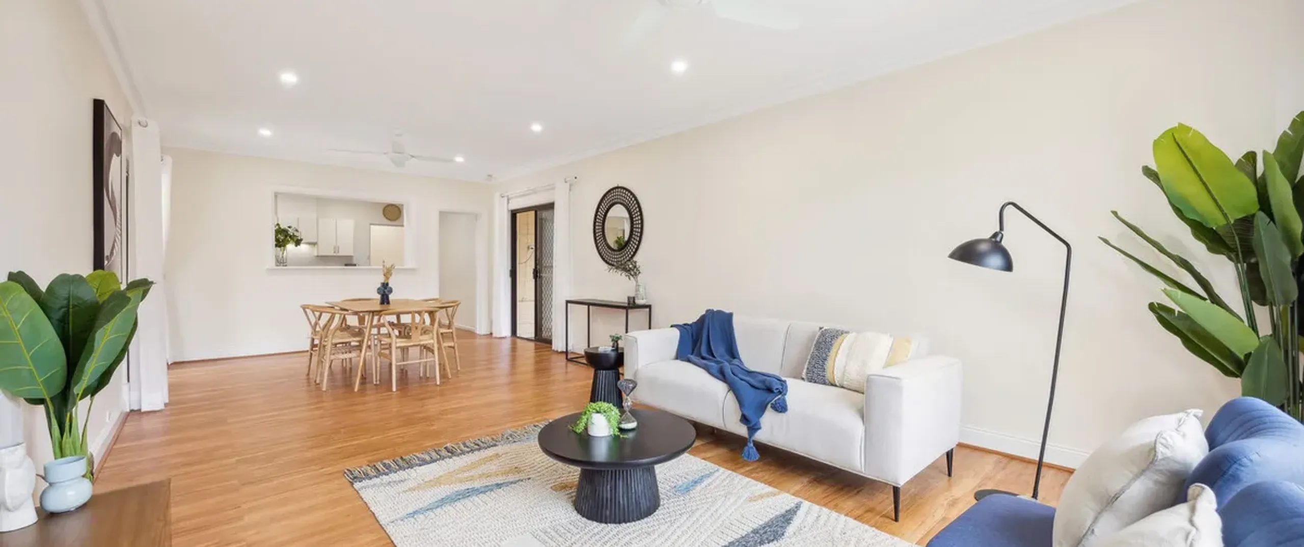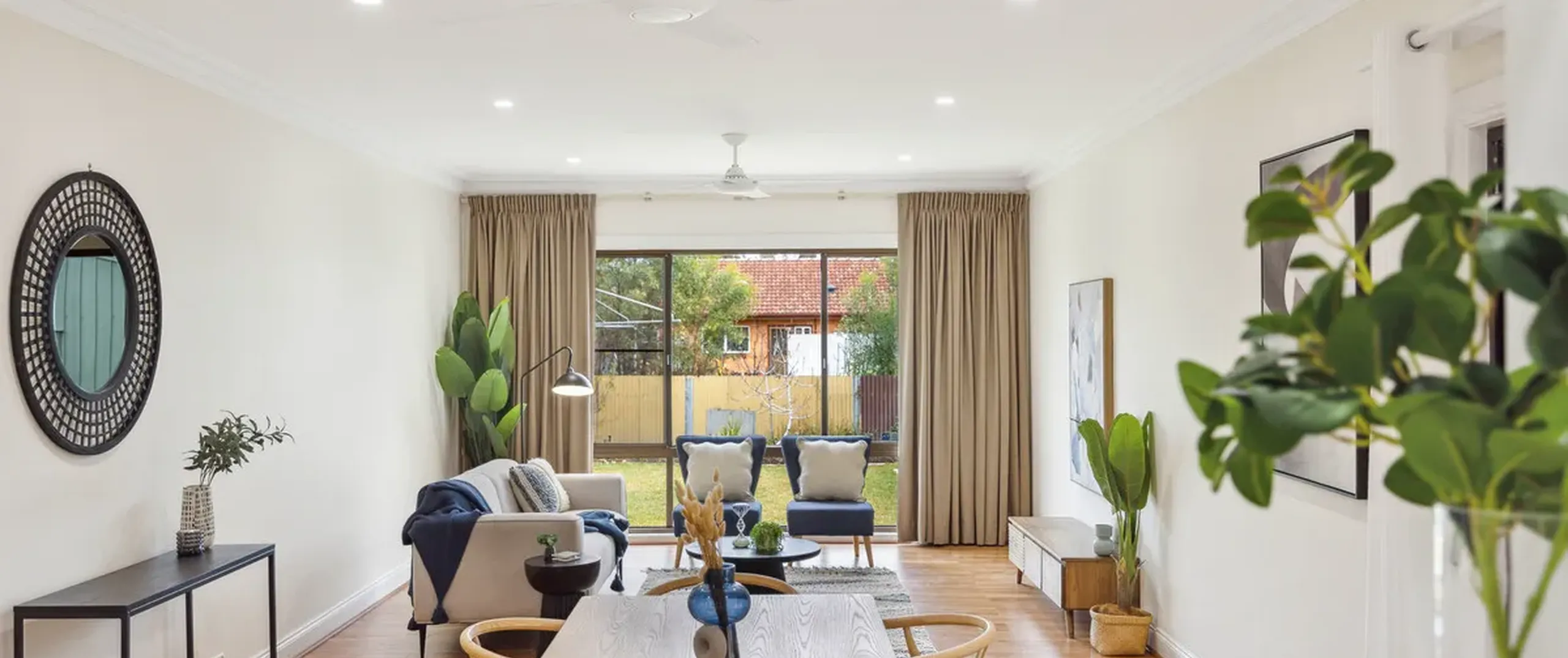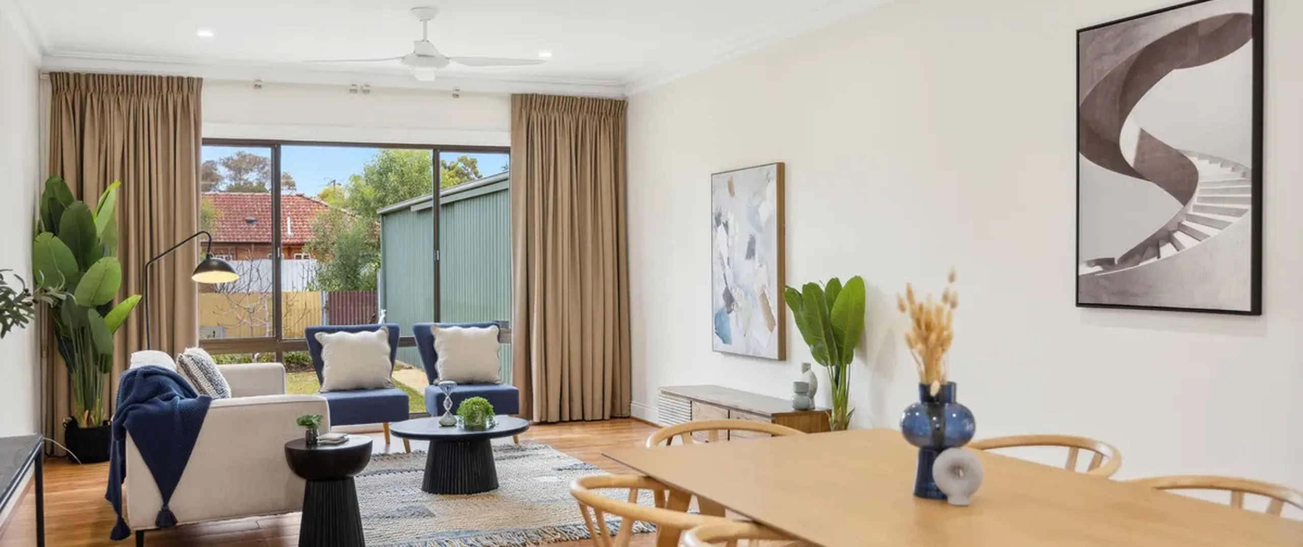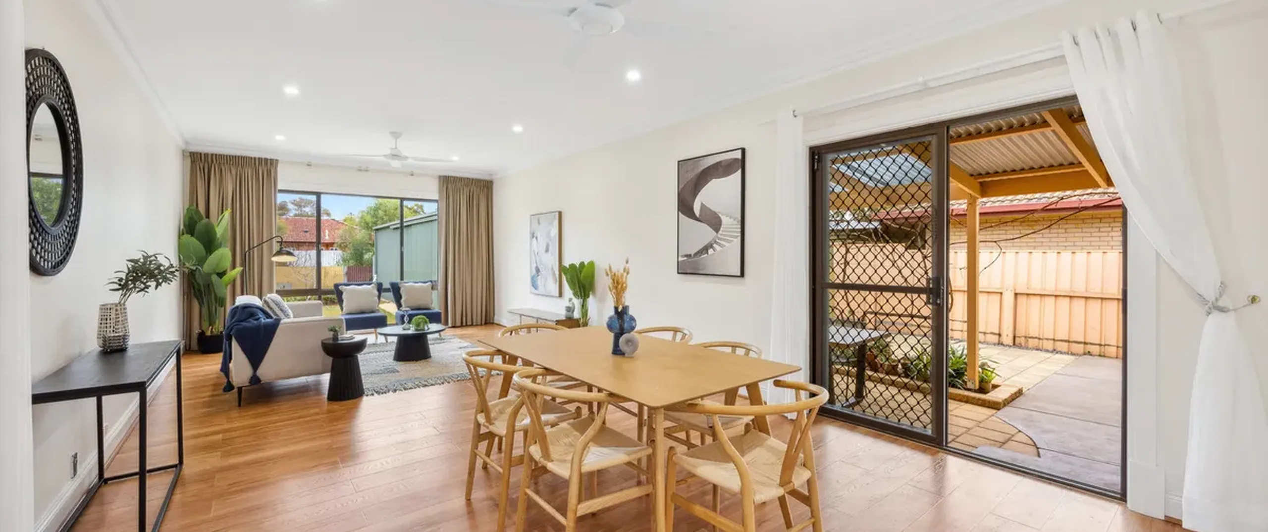 - Large open plan living and dining room with ceiling fans and gas heater
