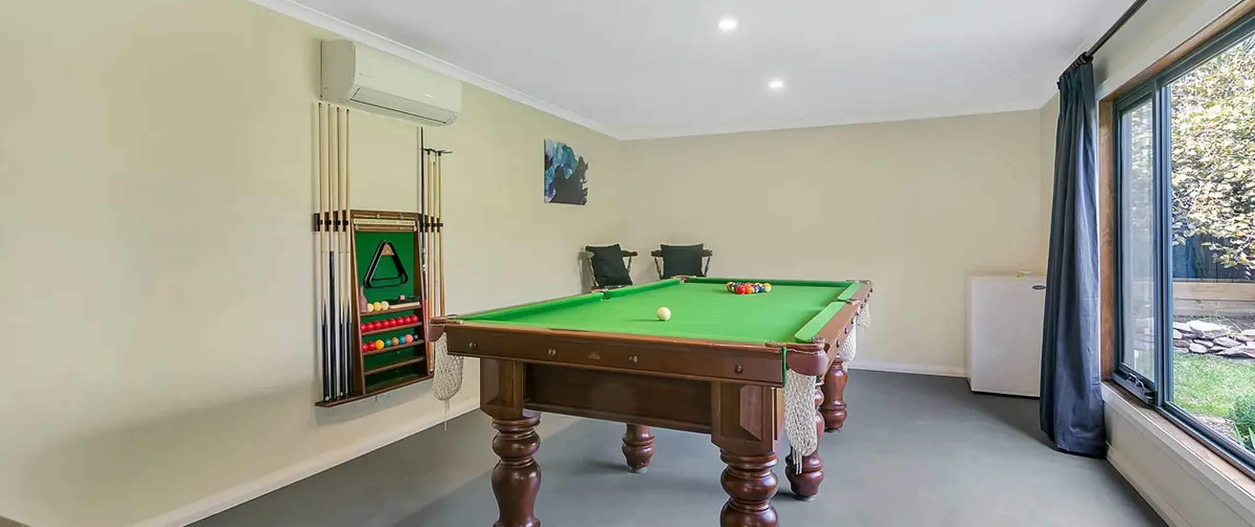 - Open plan family and dining room with split system air conditioner and ceiling fan