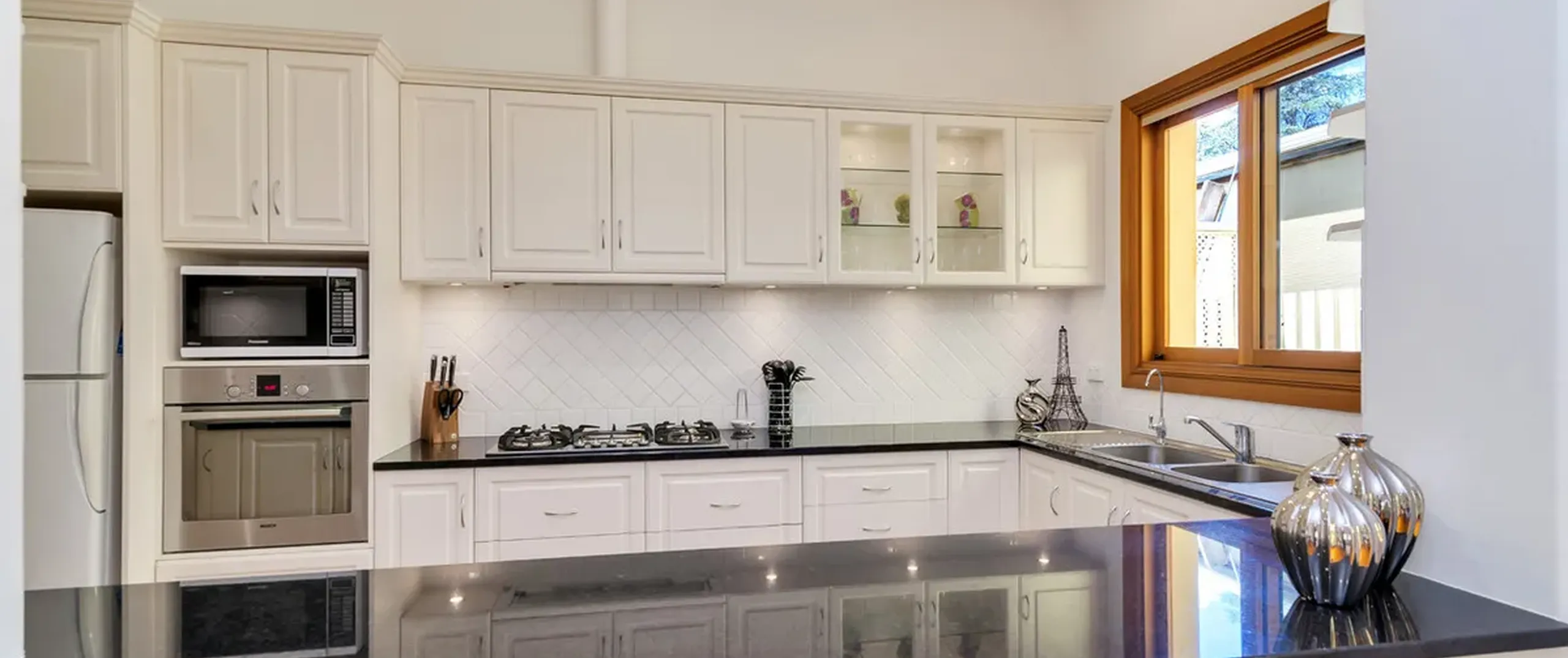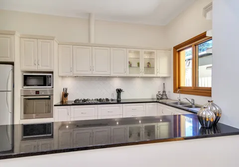 - Modern kitchen with gas cooktop, servery and ample bench and cupboard space