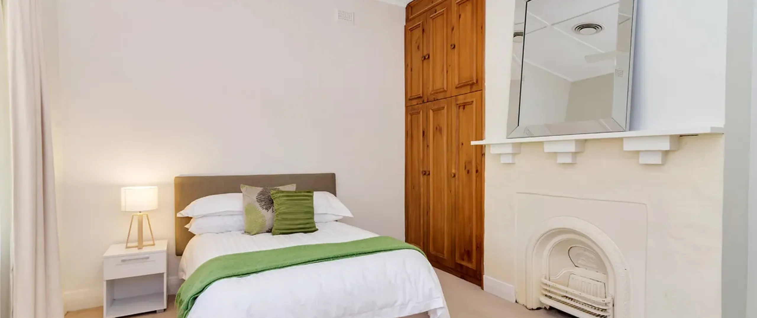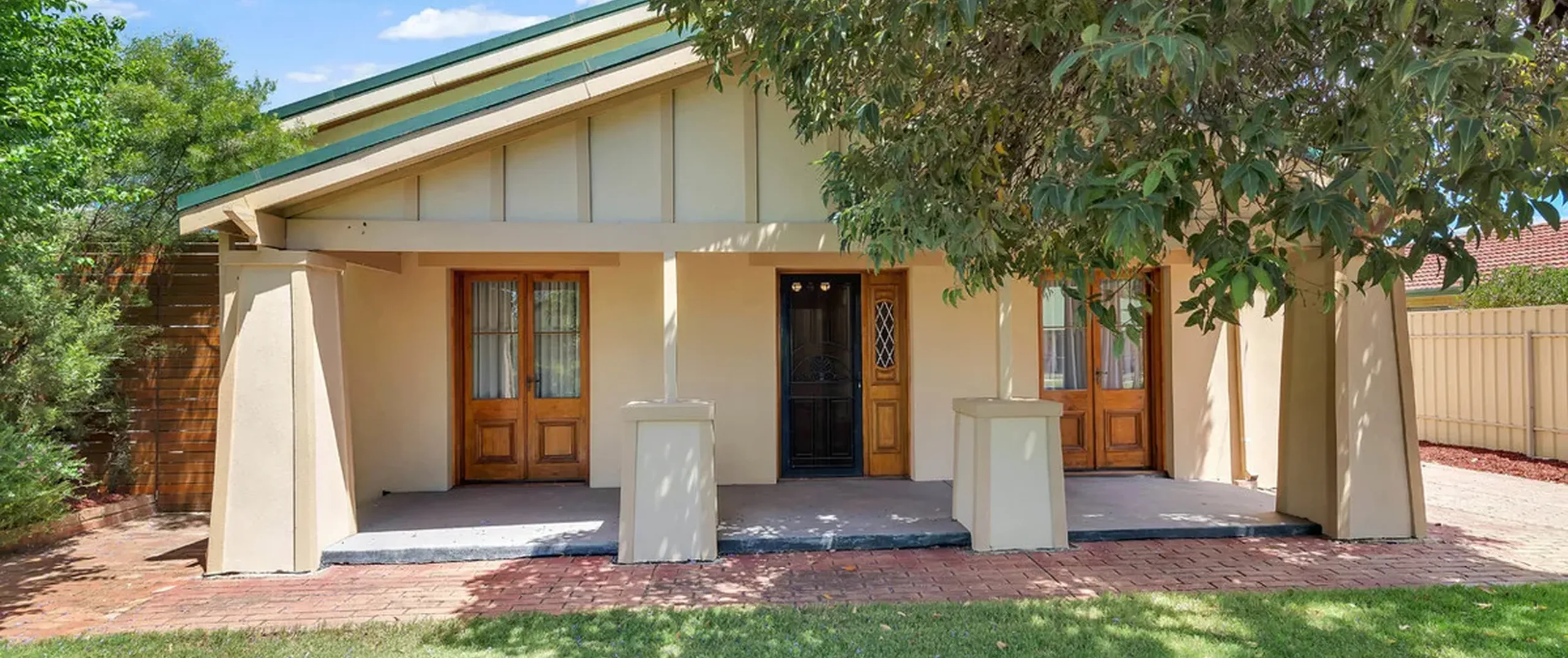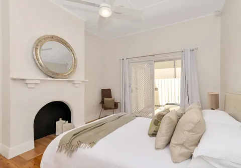 - Bedroom 2 with French doors to the front verandah, built-in robe and feature fireplace