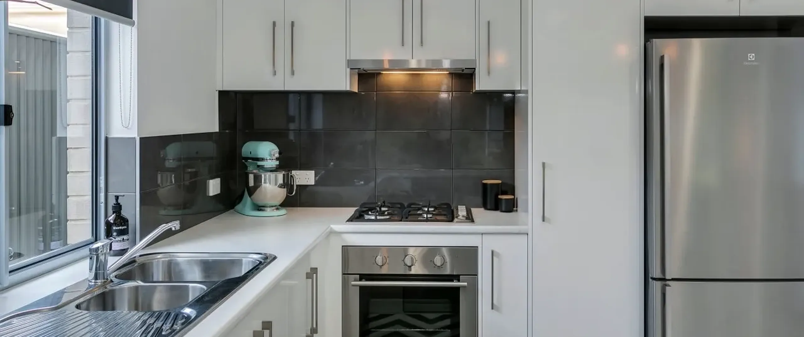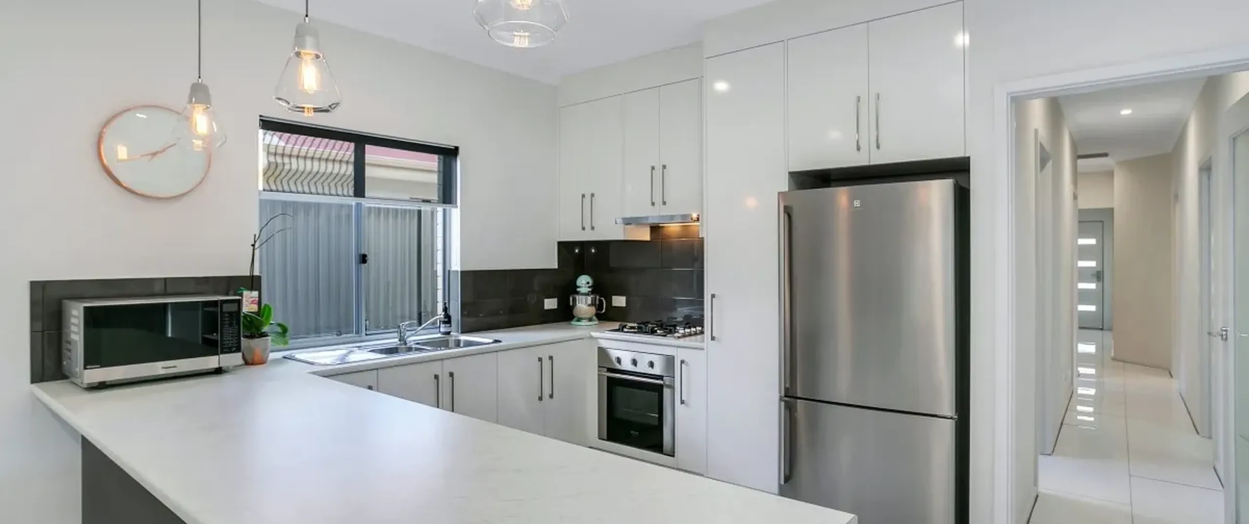 - Modern kitchen with gas cooktop, dishwasher, ample bench and cupboard space and breakfast bar
