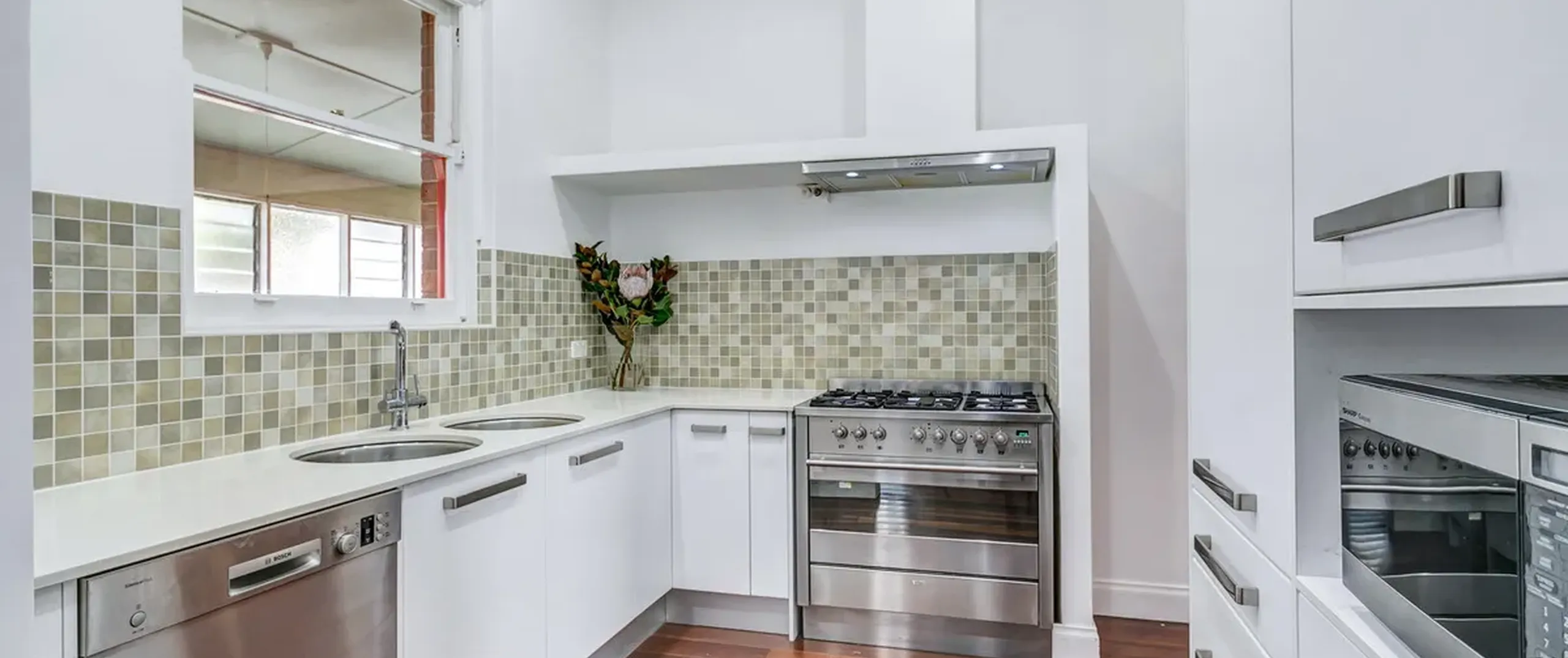 - Updated kitchen with stainless steel appliances, 900mm freestanding 5 burner gas cooktop, dishwasher and dual sinks