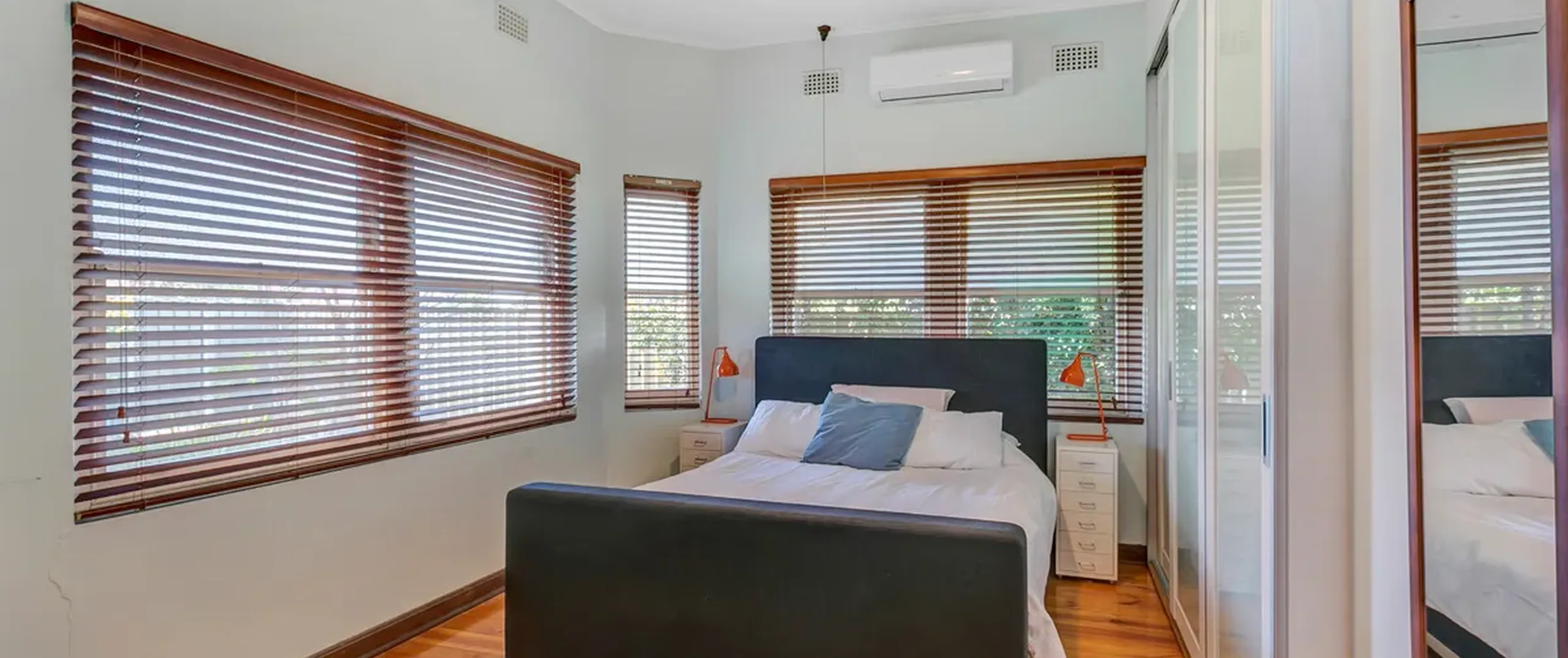 - Master bedroom with built-in robe, ceiling fan and split system air conditioner