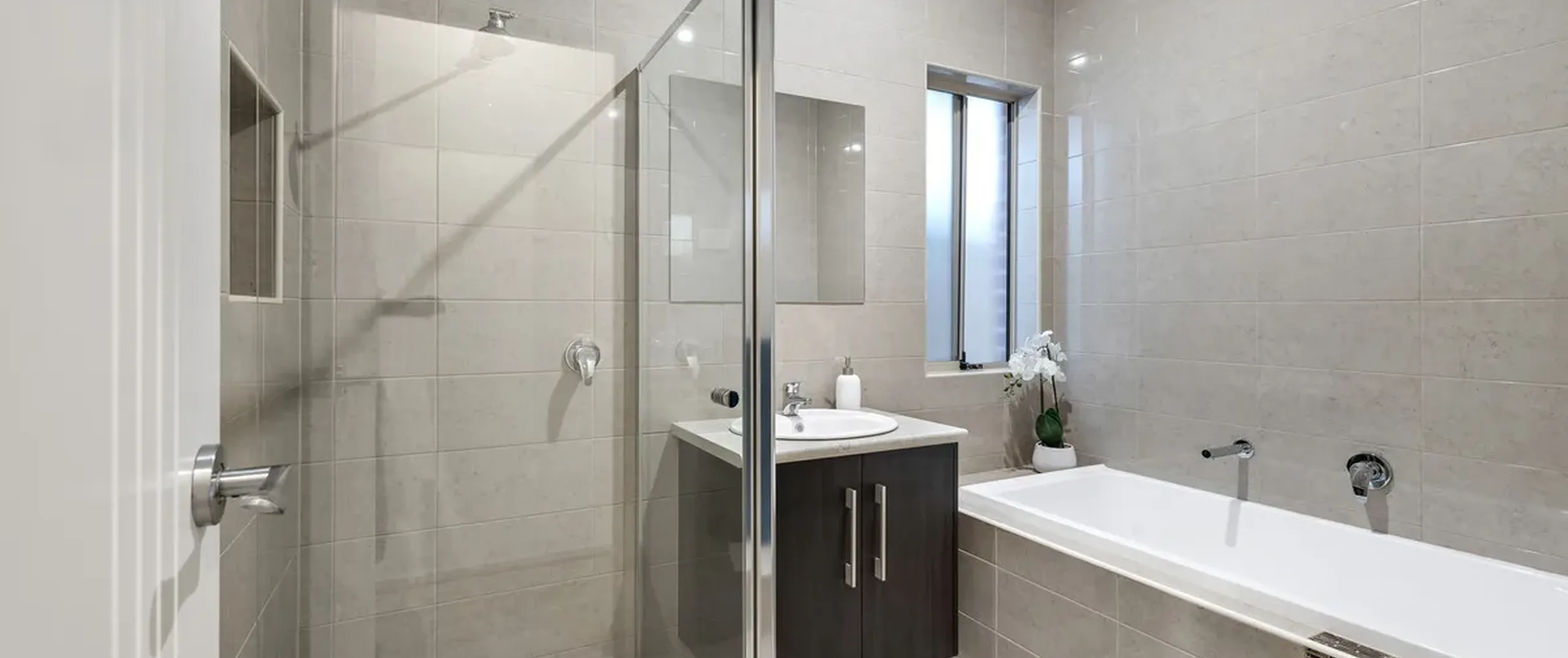 - Exquisite main bathroom with separate bath and shower + separate toilet, featuring floor to ceiling tiling