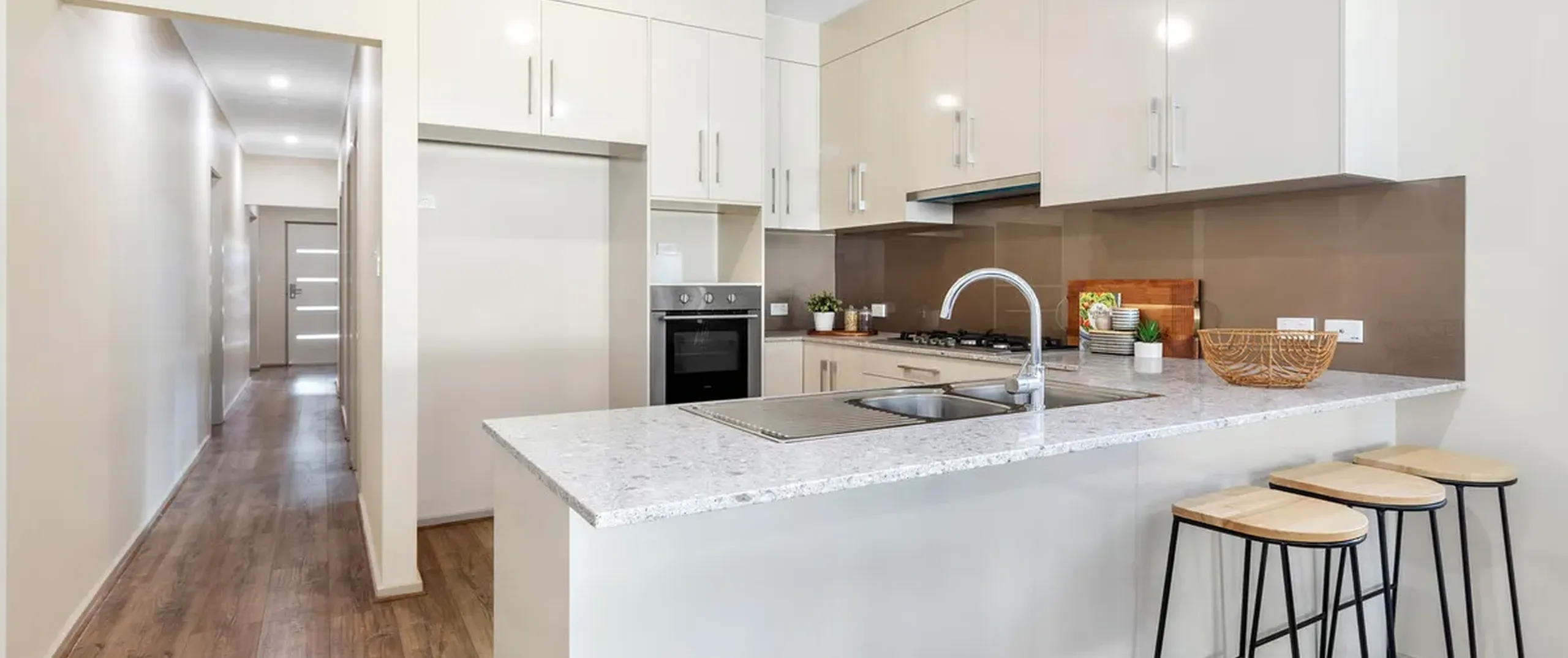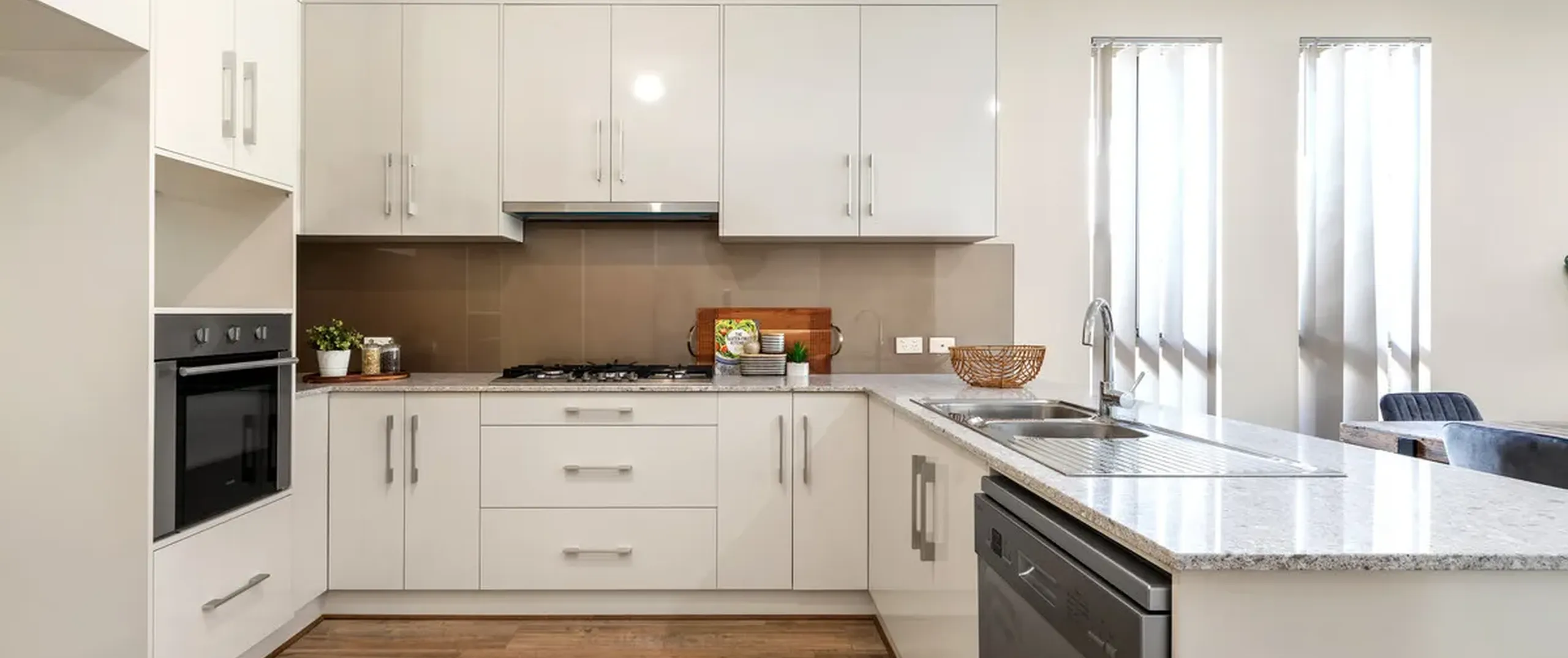 - Modern kitchen with stone benchtops, gas cooktop and breakfast bar