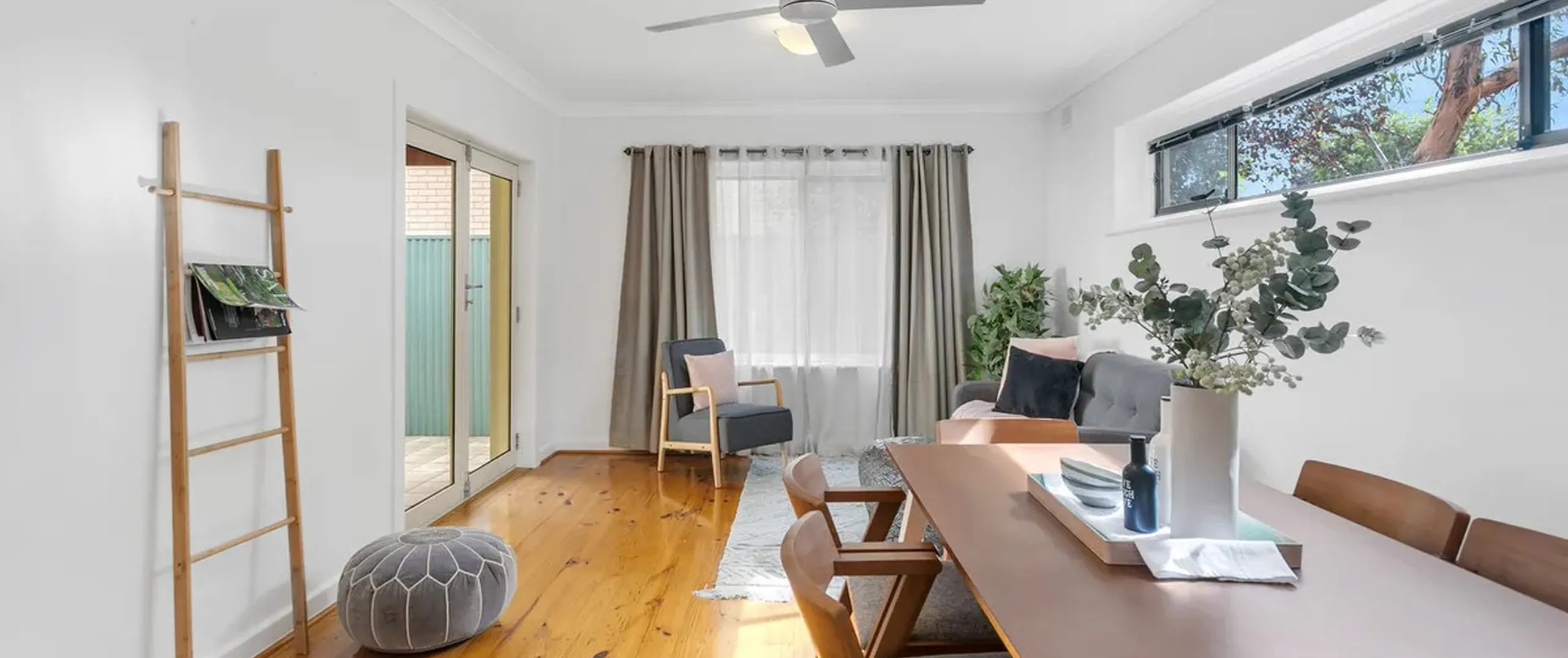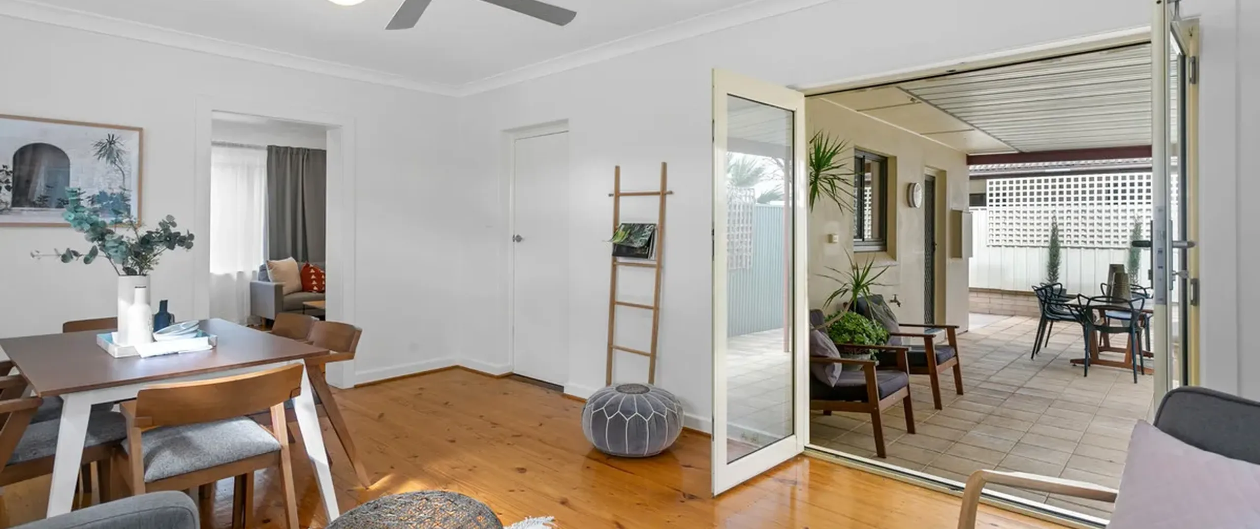- Family/dining room with ceiling fan and French Doors to outdoor entertaining