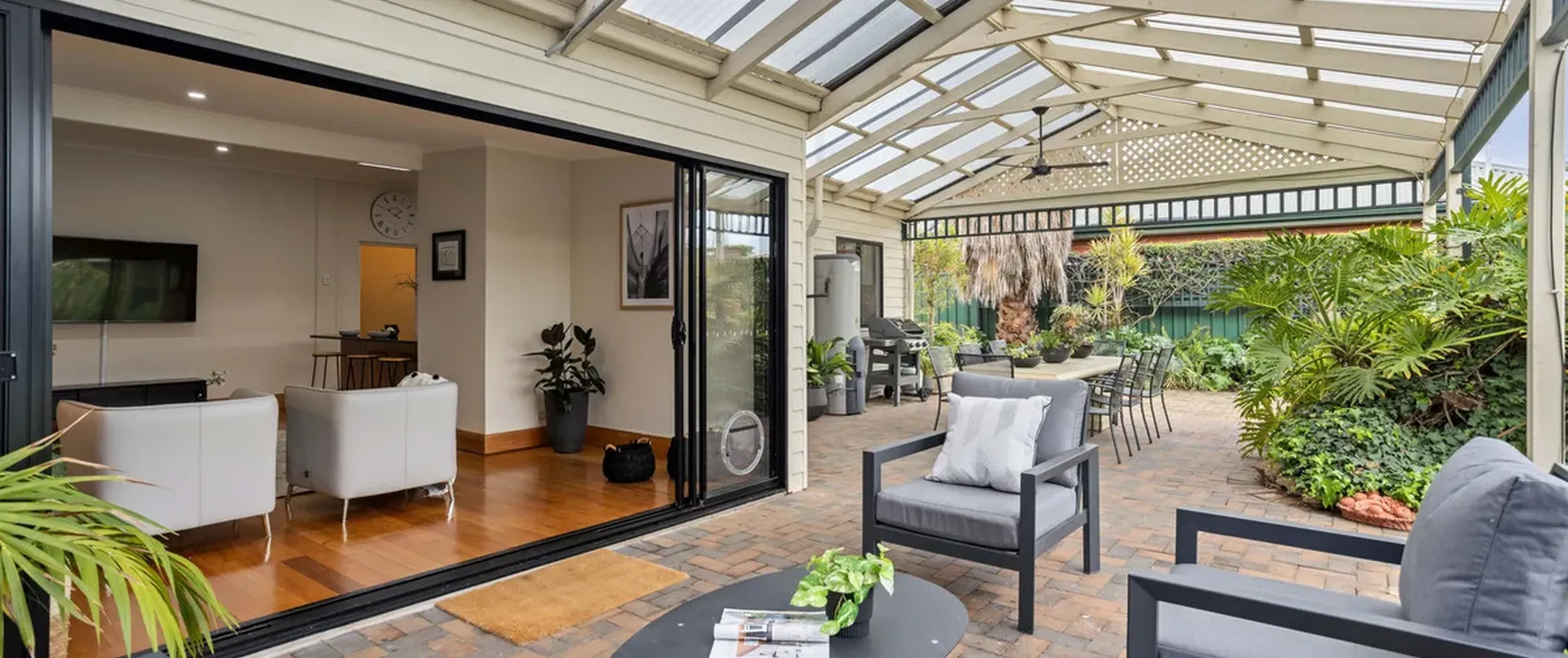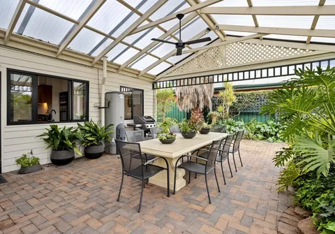 - Pitched roof verandah complete with two ceiling fans provides the perfect space for outdoor entertaining