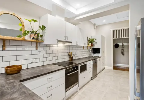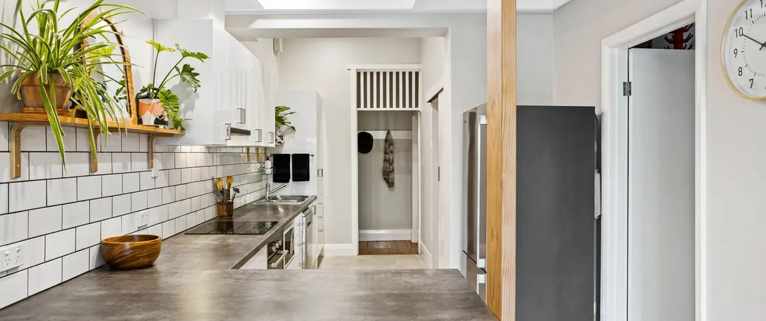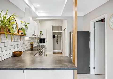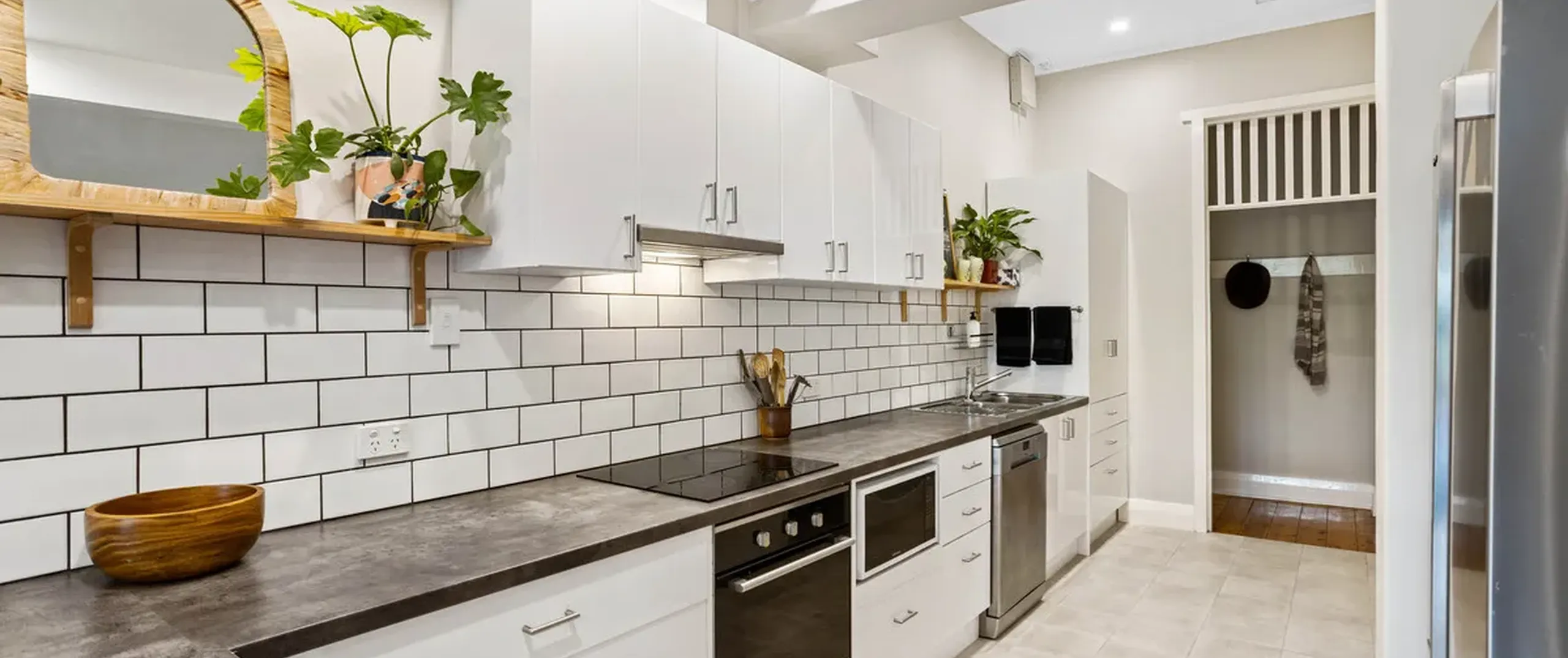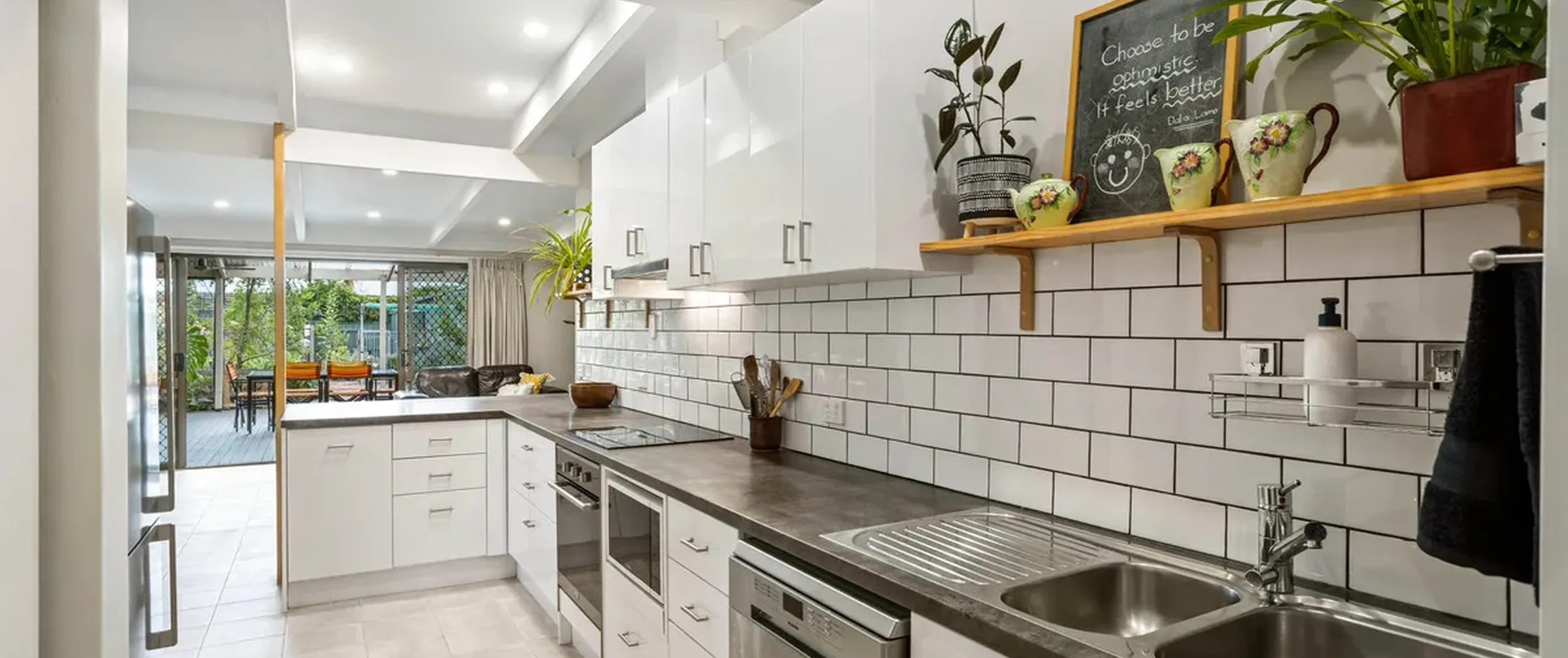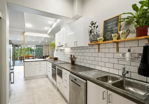 - Stylish updated kitchen with stainless steel dishwasher, ample white cabinetry and sweeping benchtops with breakfast bar