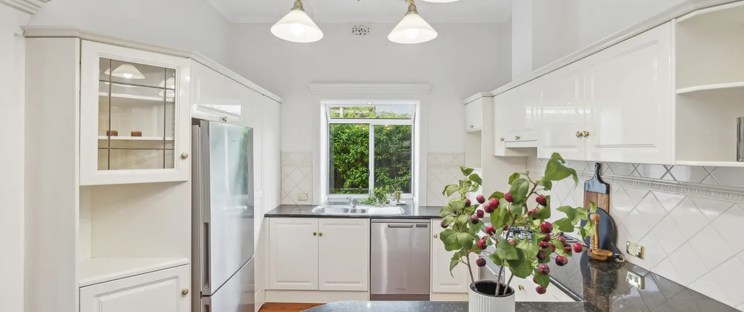 - Classic, white kitchen with gas cooktop, dishwasher, breakfast bar, ample bench and cupboard space