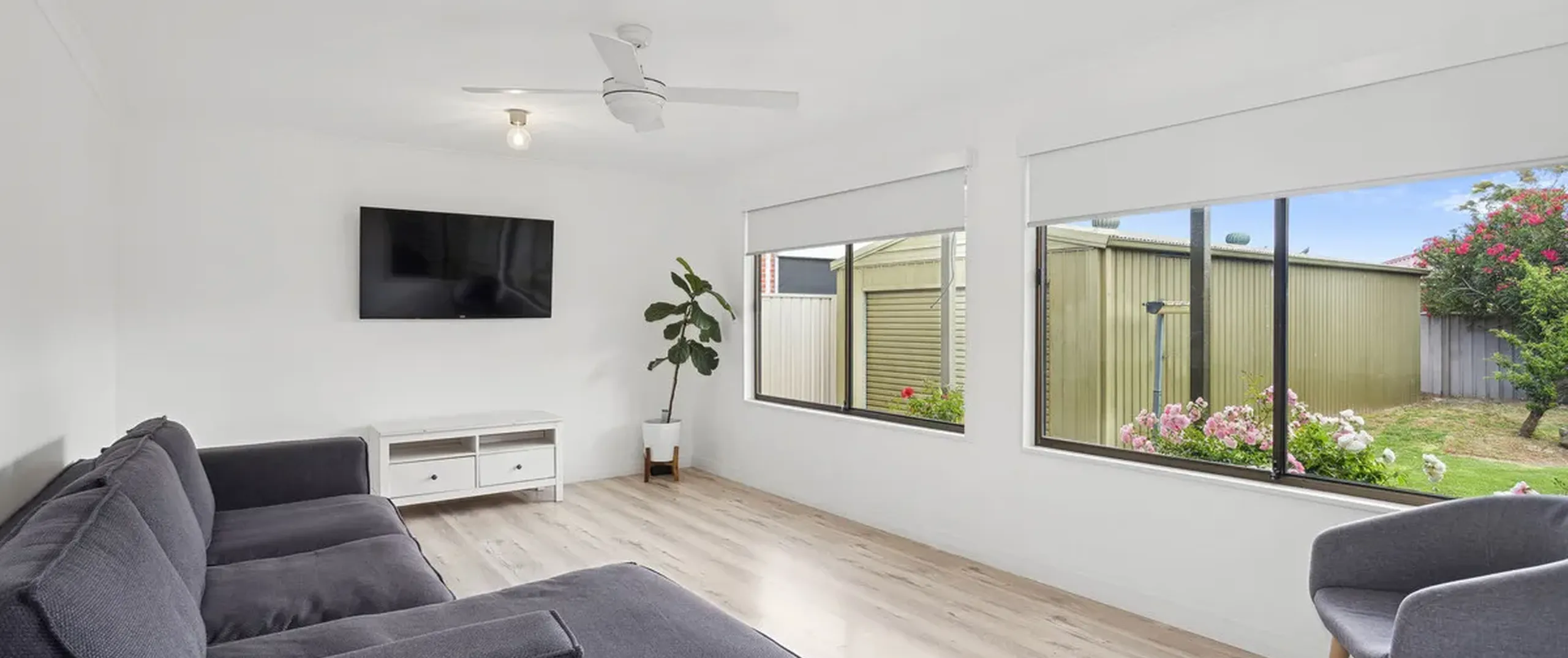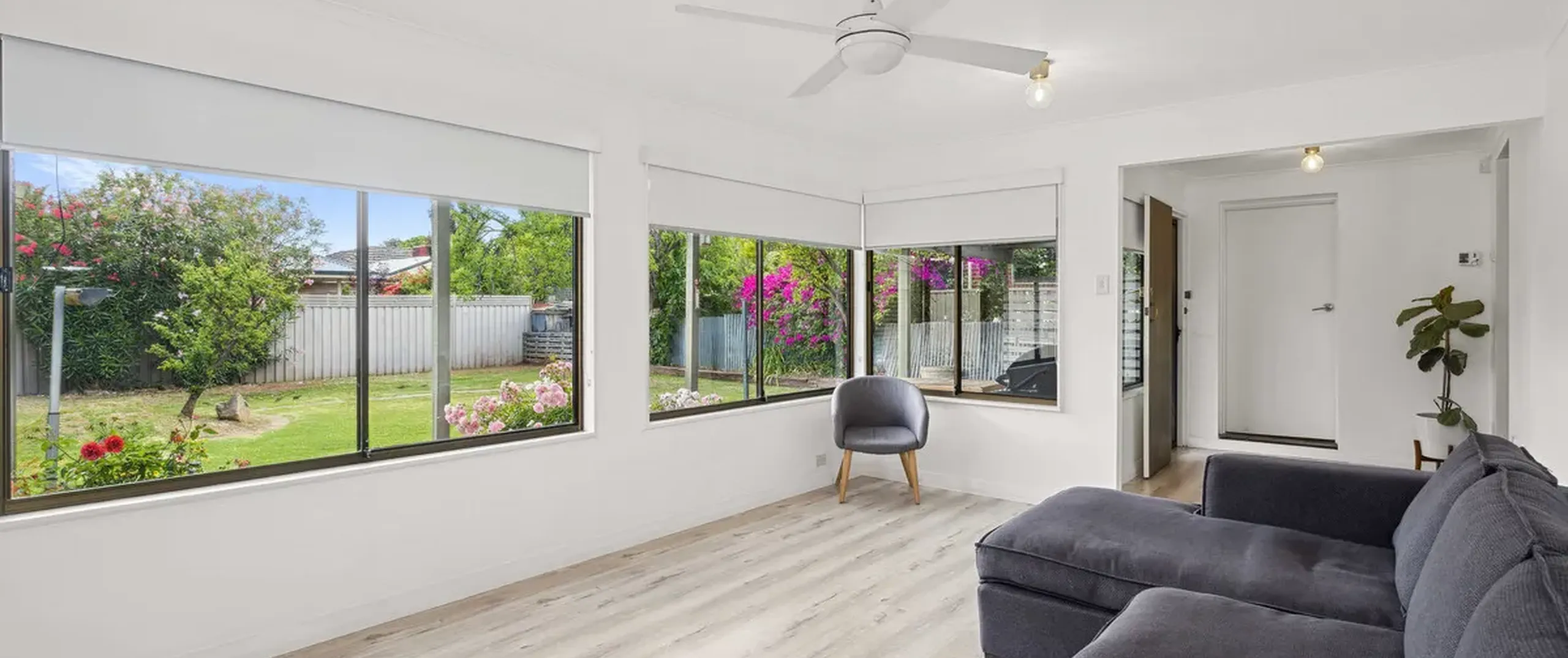 - Large light filled living room with ceiling fan