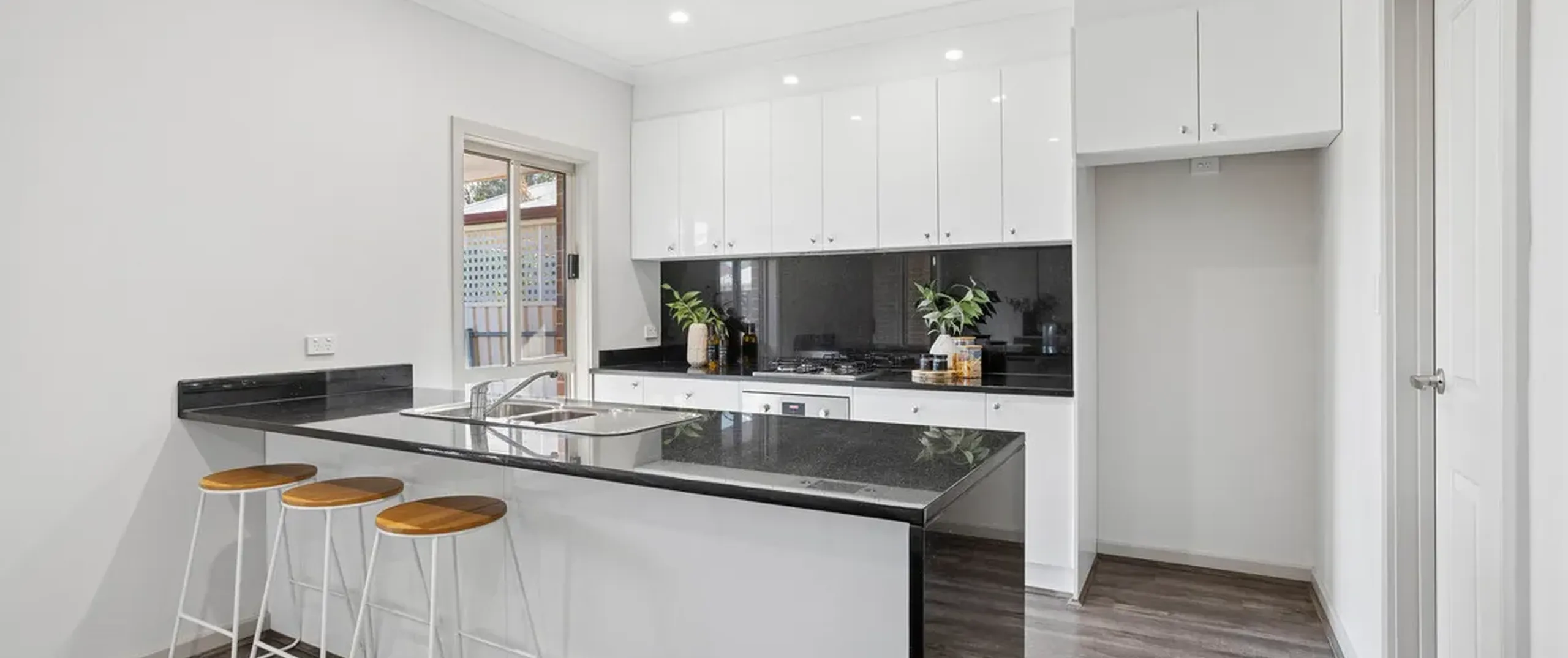 - Modern kitchen with gas cooktop, breakfast bar and ample bench and cupboard space