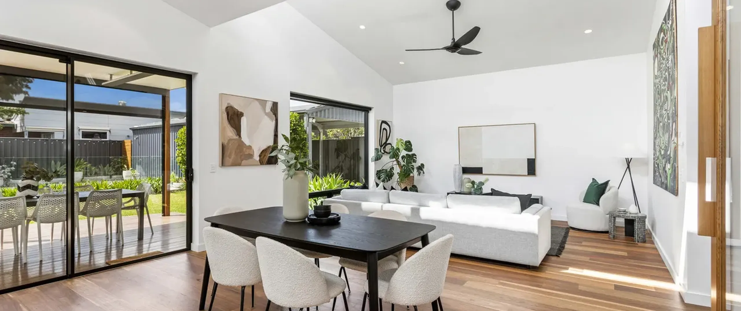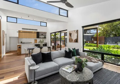 - Lavish, light-filled open-plan living area with high ceilings, perfectly positioned highlight windows, and sliding glass door access to the picture-perfect alfresco and yard