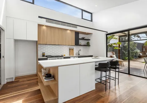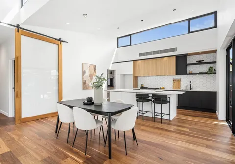 At the centre of this remarkable home lies a stunning open-plan family and dining area designed and built by the esteemed Residence Building Group, featuring a double skillion roof and perfectly positioned highlight windows that flood the space with glorious sunlight and provide natural convection airflow.