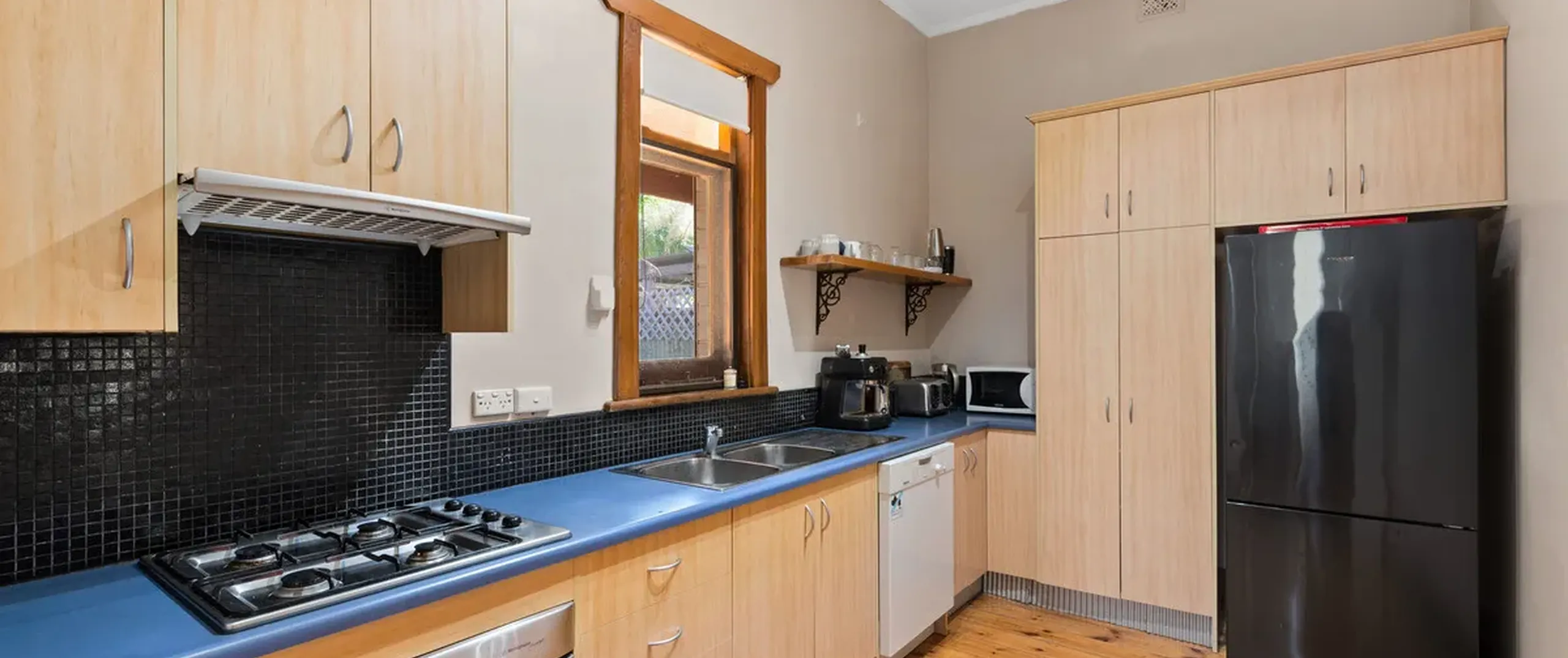 - Simple kitchen with stainless appliances including gas cooktop and oven, light wooden cupboards with large pantry