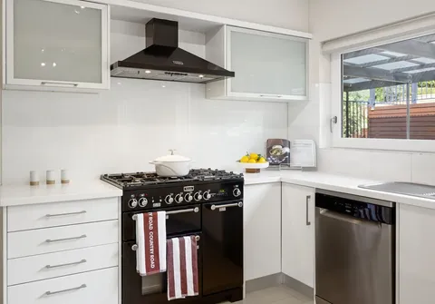 - Modern kitchen with gas cooktop, oven, dishwasher and breakfast bar