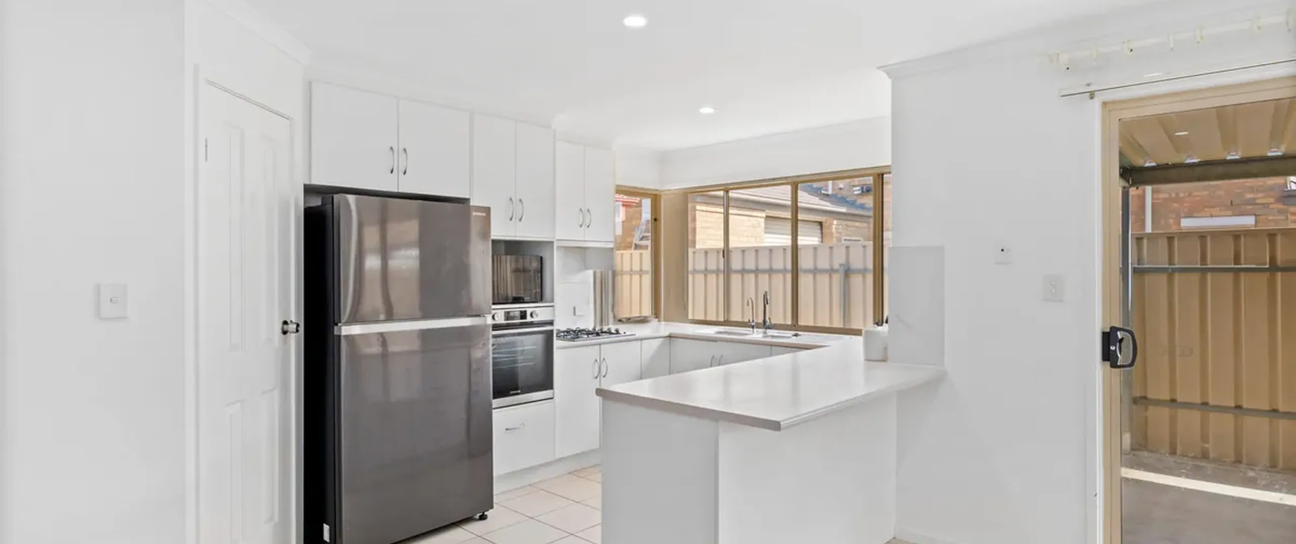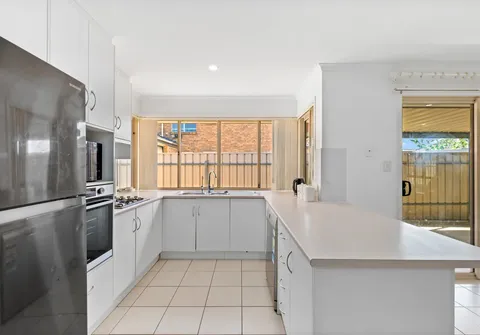 A modern kitchen, with stainless steel appliances, sits in the heart of this home, enveloped by an open-plan living and dining area. A lounge and dining are located at the front of the home for additional space to host guests.