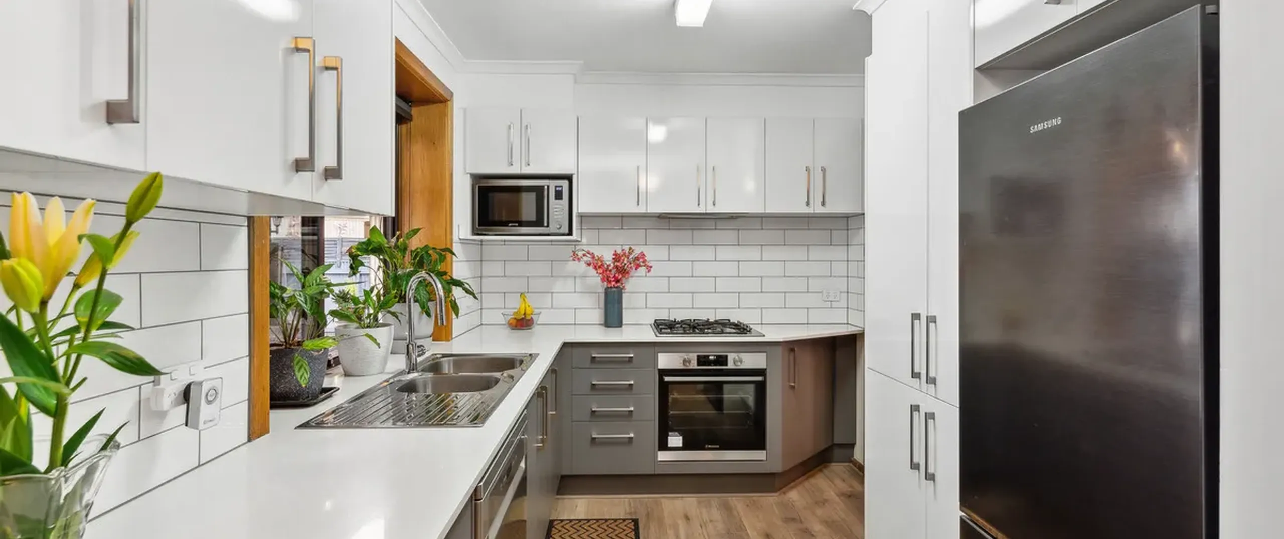 - Chic kitchen with Westinghouse stainless steel appliances including dishwasher, oven and gas cooktop and ample cupboard and bench space