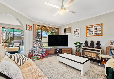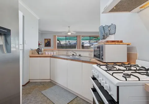 Adding to the appeal is a spacious, light-filled living area upon entry, seamlessly flowing through to the nearby dining space, which overlooks the well-appointed kitchen. All three bedrooms are generous in size and feature ceiling fans, conveniently positioned around the central main bathroom. Completing this impressive package is the shaded pergola area - perfect for year-round entertaining - as well as a secure single carport with roller door for added peace of mind.
