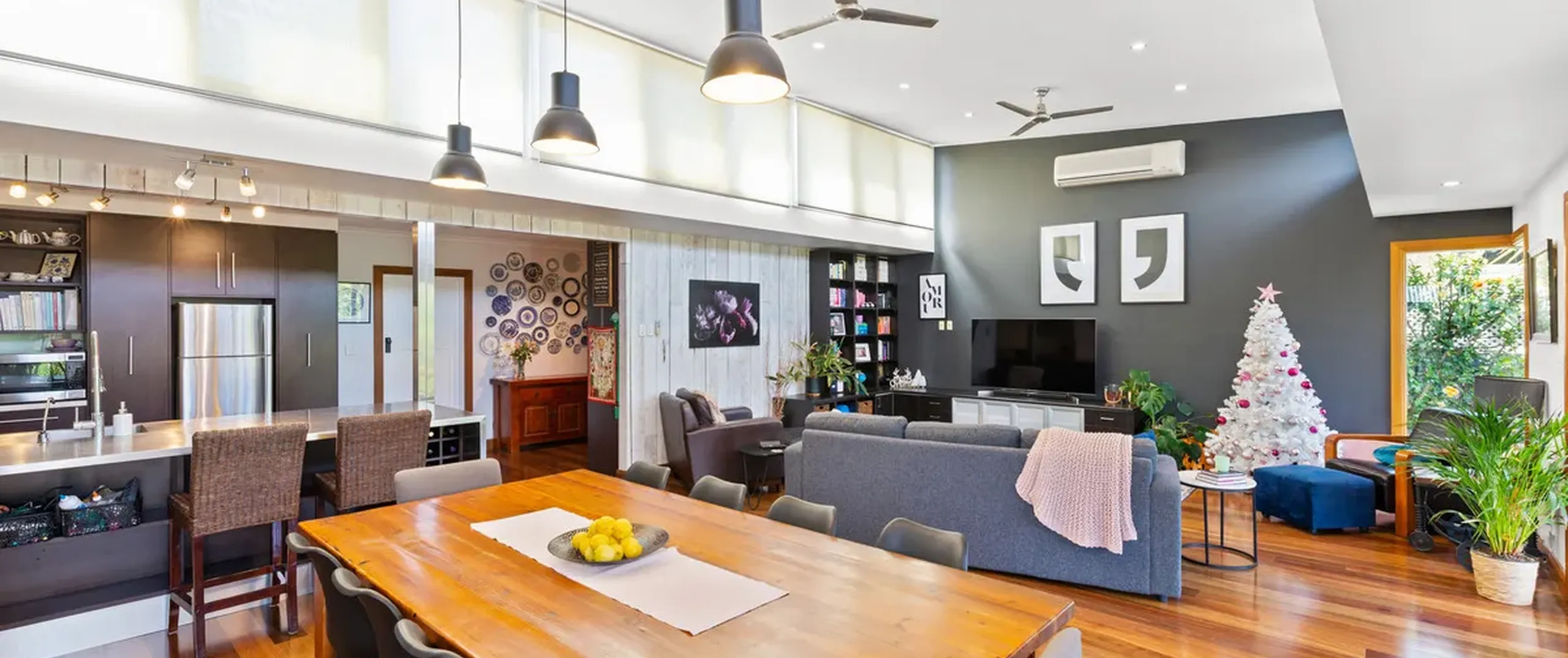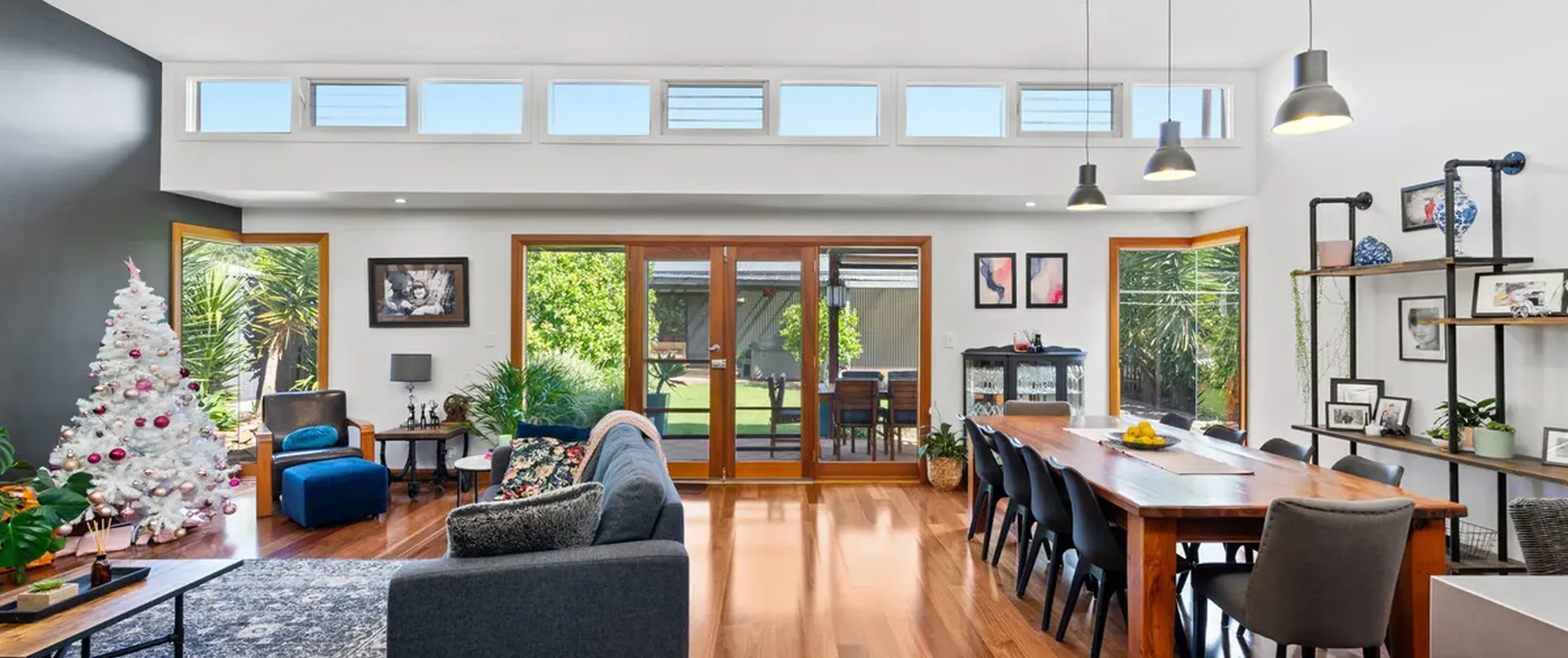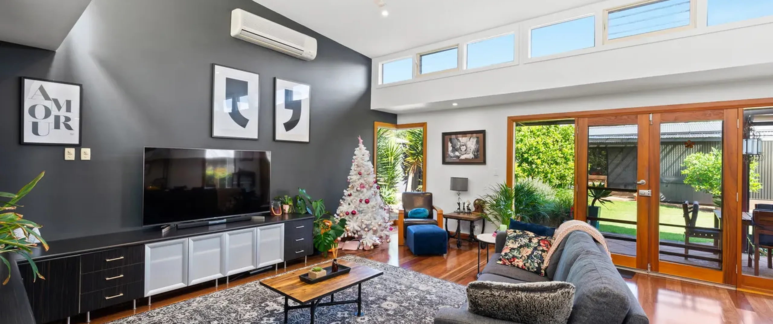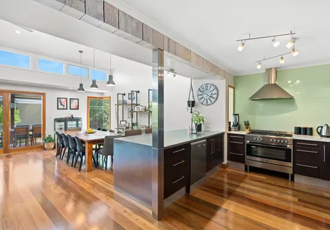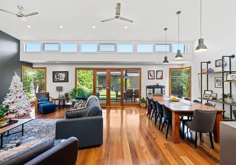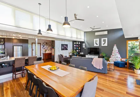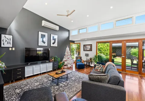 - Commodious open plan family and dining with stunning French doors, ample natural light, polished floorboards, ceiling fans and split system air conditioner for year-round comfort