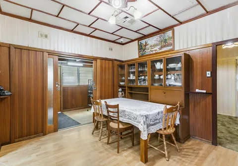 - Dining room with built-in cupboards, adjoining both the lounge and kitchen