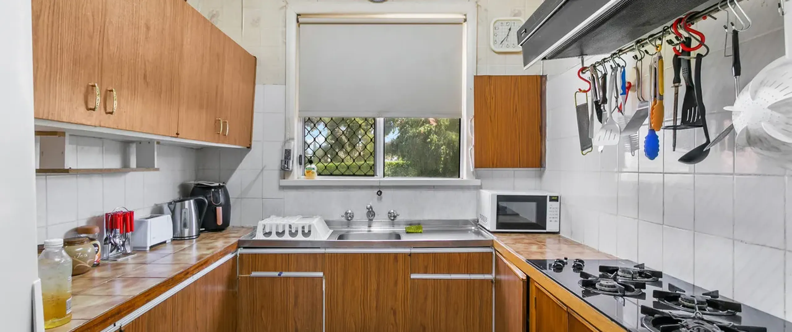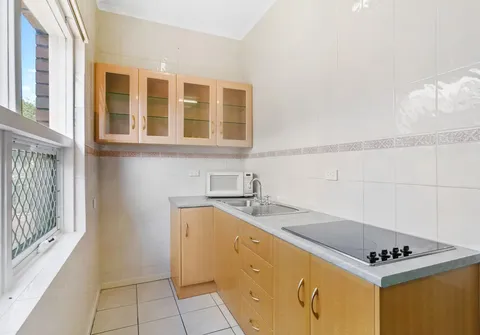- Functional kitchen with gas cooktop and ample cupboard and bench space