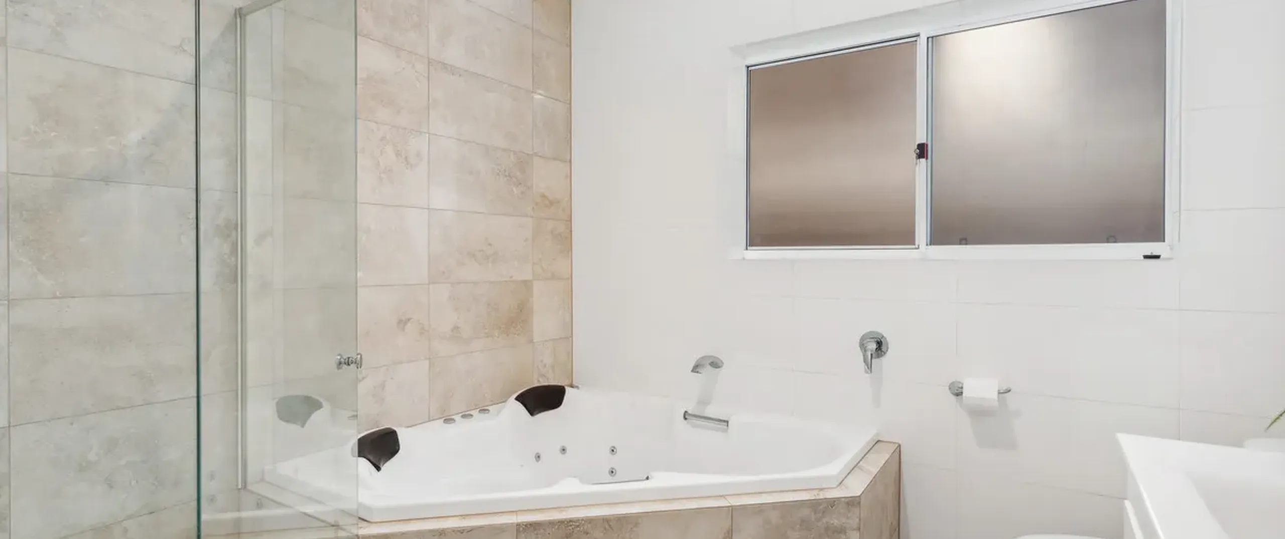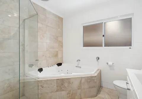- Modern main bathroom features a corner spa, a separate shower, and a toilet, combining style and functionality with ceiling to floor tiles