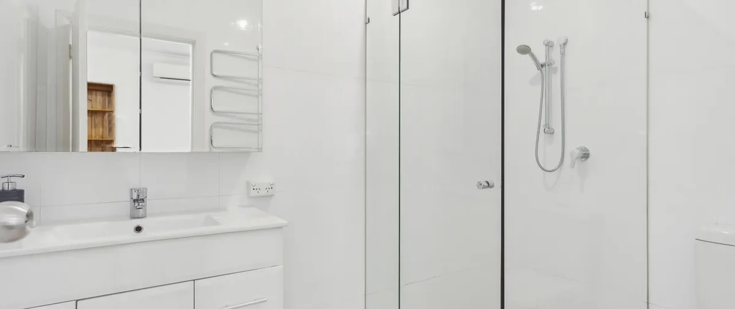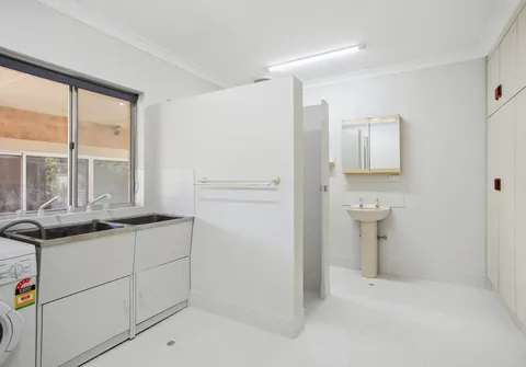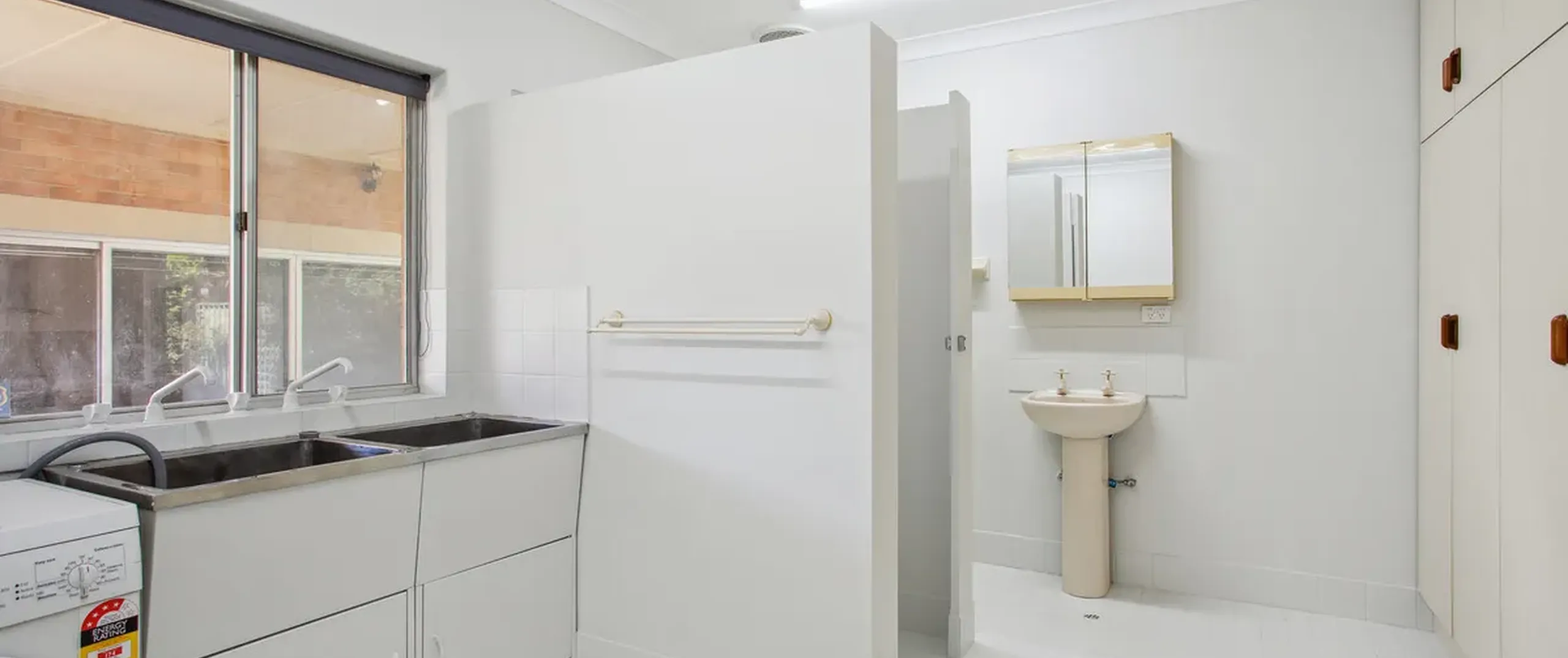 - The combined laundry and bathroom including shower, toilet, and built-in cupboard, offering practical storage in one space