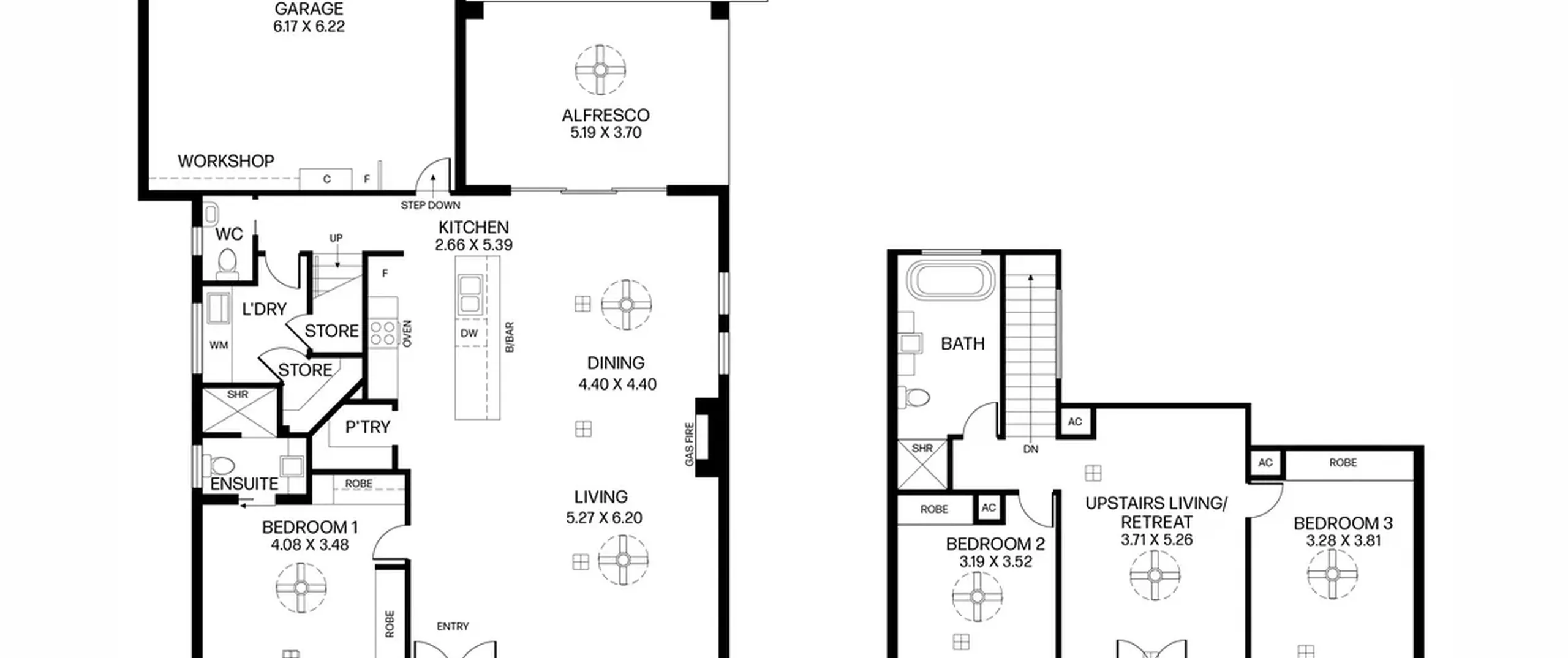 - Light filled open living, dining and kitchen area with gas fireplace and ceiling fans