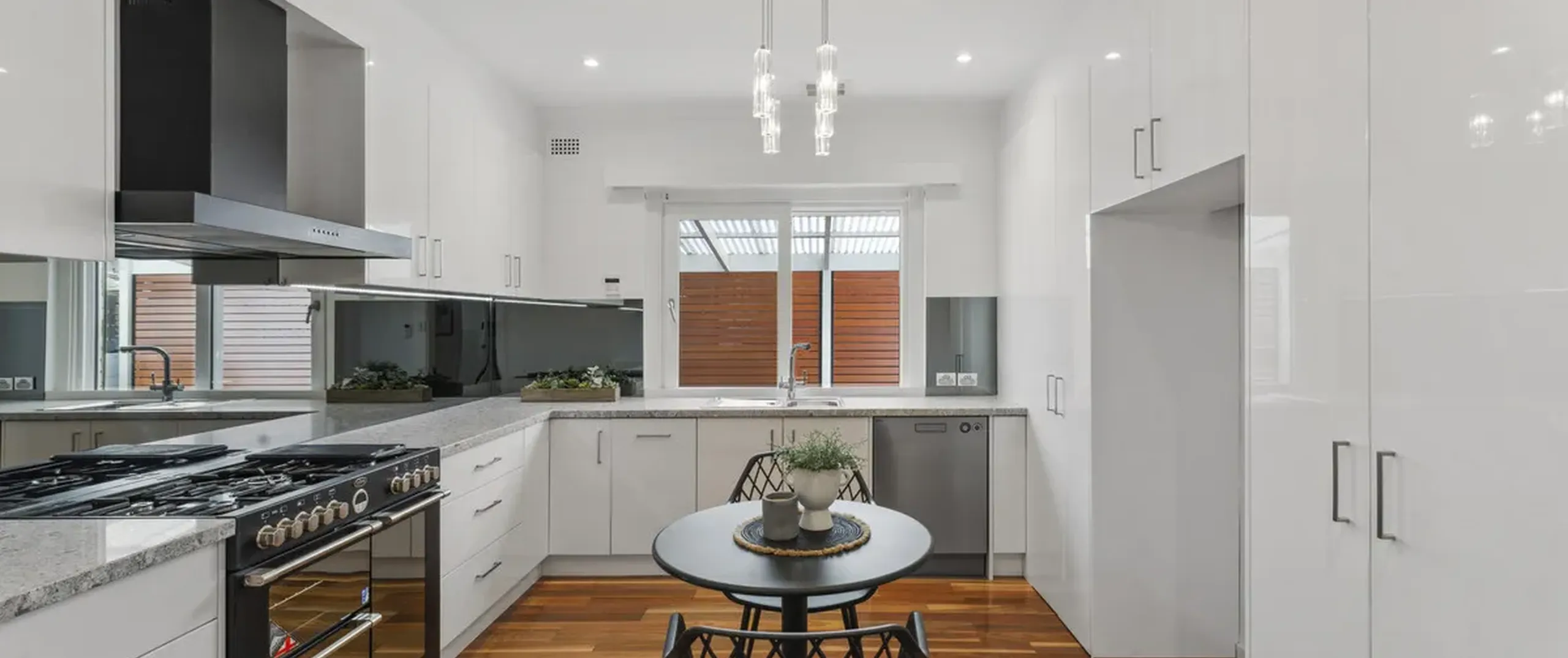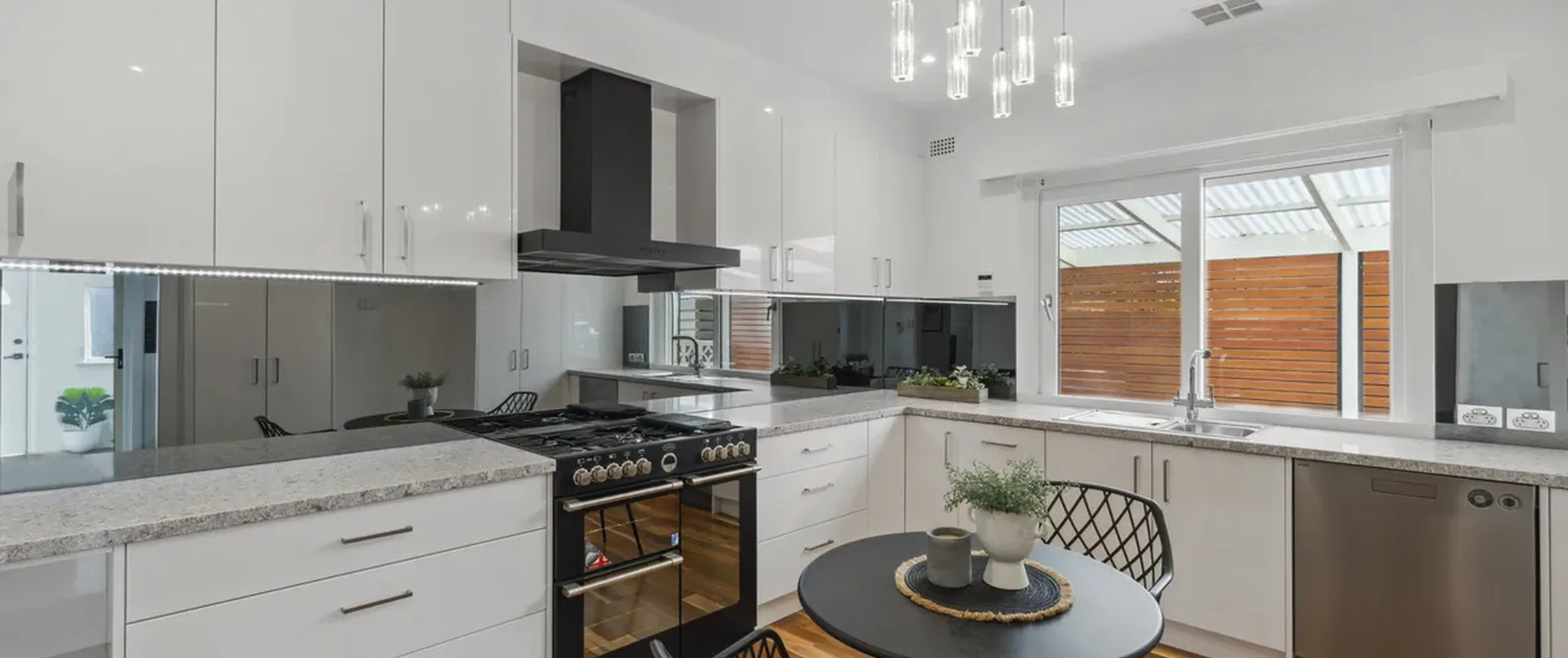 - Beautifully updated modern kitchen with mirrored splash back, dishwasher, black gas cooker, oven and rangehood