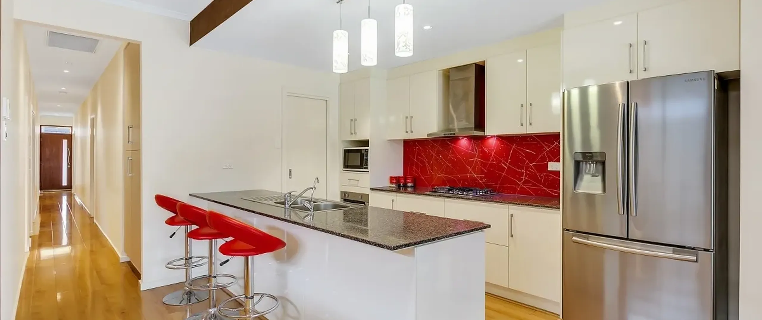 - Modern, stylish kitchen with glass splashback, stone benchtop, butler's pantry, gas cooktop, dishwasher, breakfast bar and ample bench and cupboard space