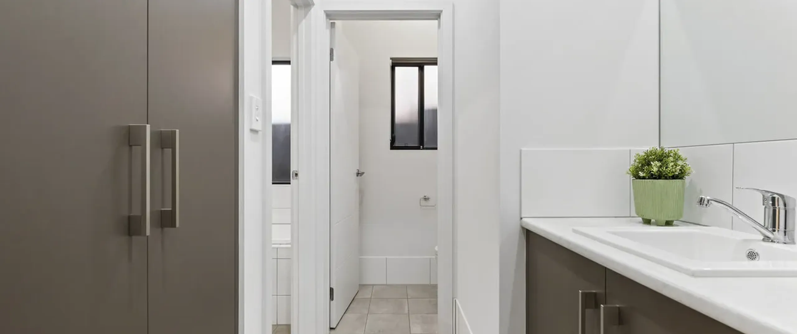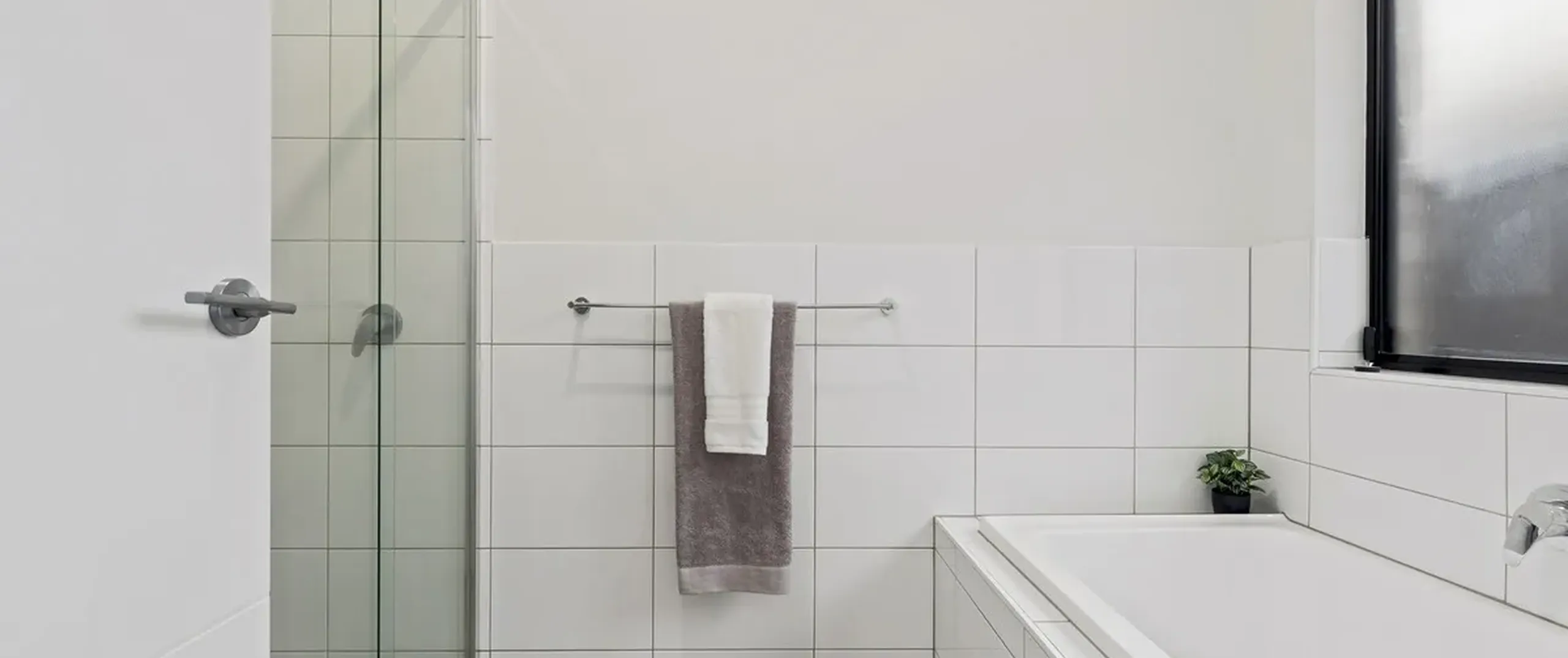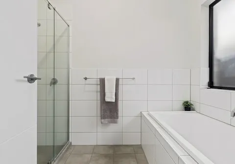 - Contemporary three-way bathroom with separate bath and shower + linen storage