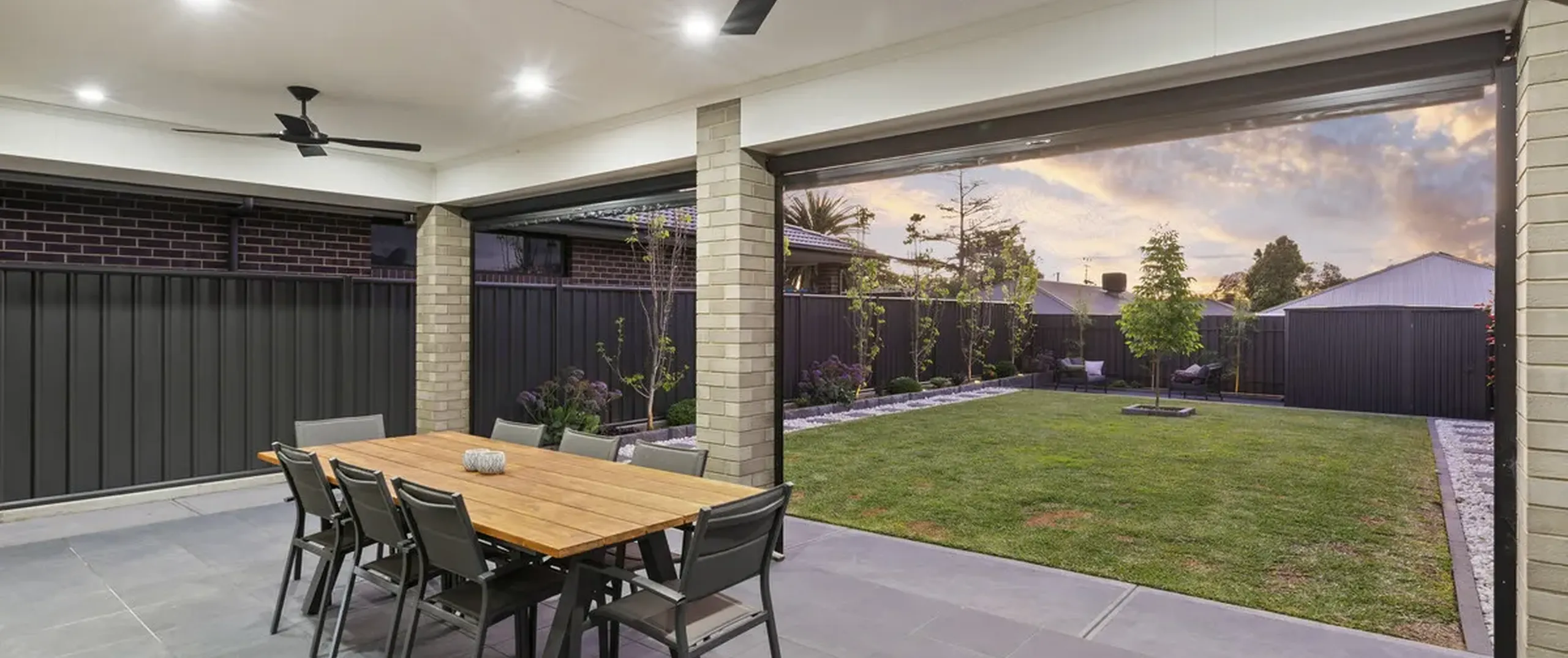 - Tiled alfresco with ceiling fans and café blind making for an entertainer’s dream