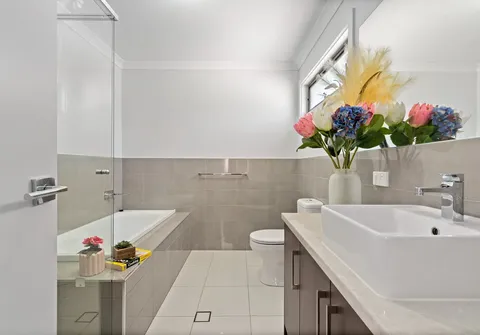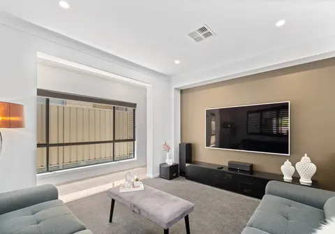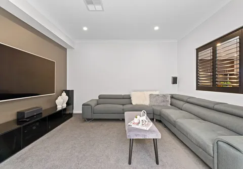 Inside, you are treated to an at home theatre or versatile living space, three lovely and generous in size bedrooms, two bathrooms including the main bedroom complete with stylish ensuite and dreamy walk-in robe. Natural light fills the open plan kitchen, living and meals space with a modern kitchen boasting gas cooktop, stainless steel appliances and dishwasher.