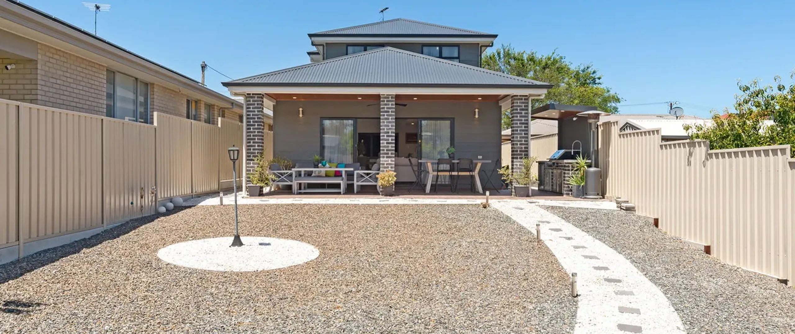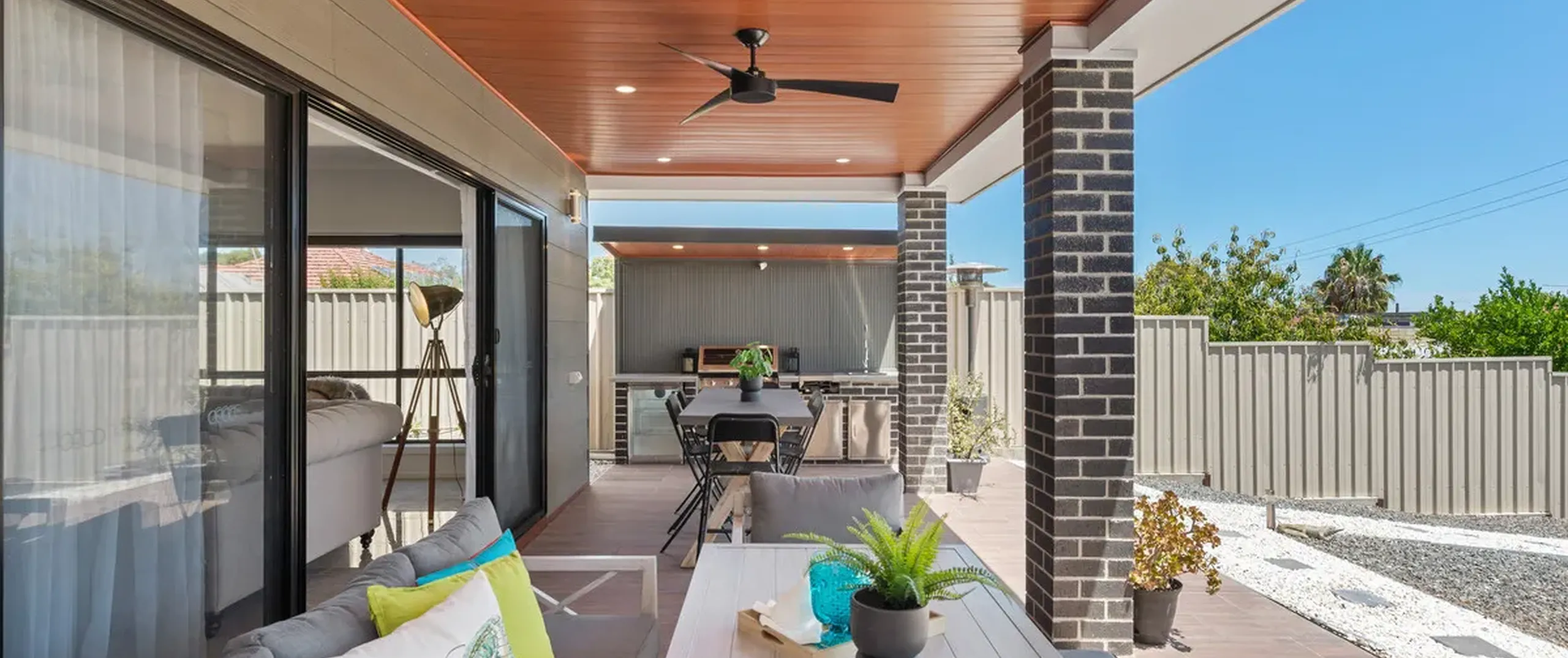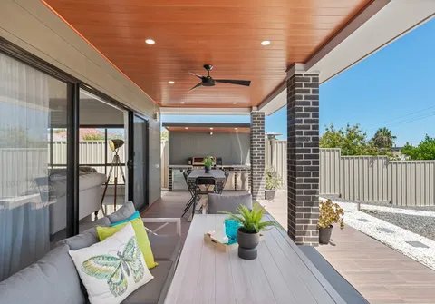 - Spacious tiled alfresco with ceiling fan and fully equipped outdoor kitchen featuring a bar fridge - Please note: the BBQ is excluded from Sale