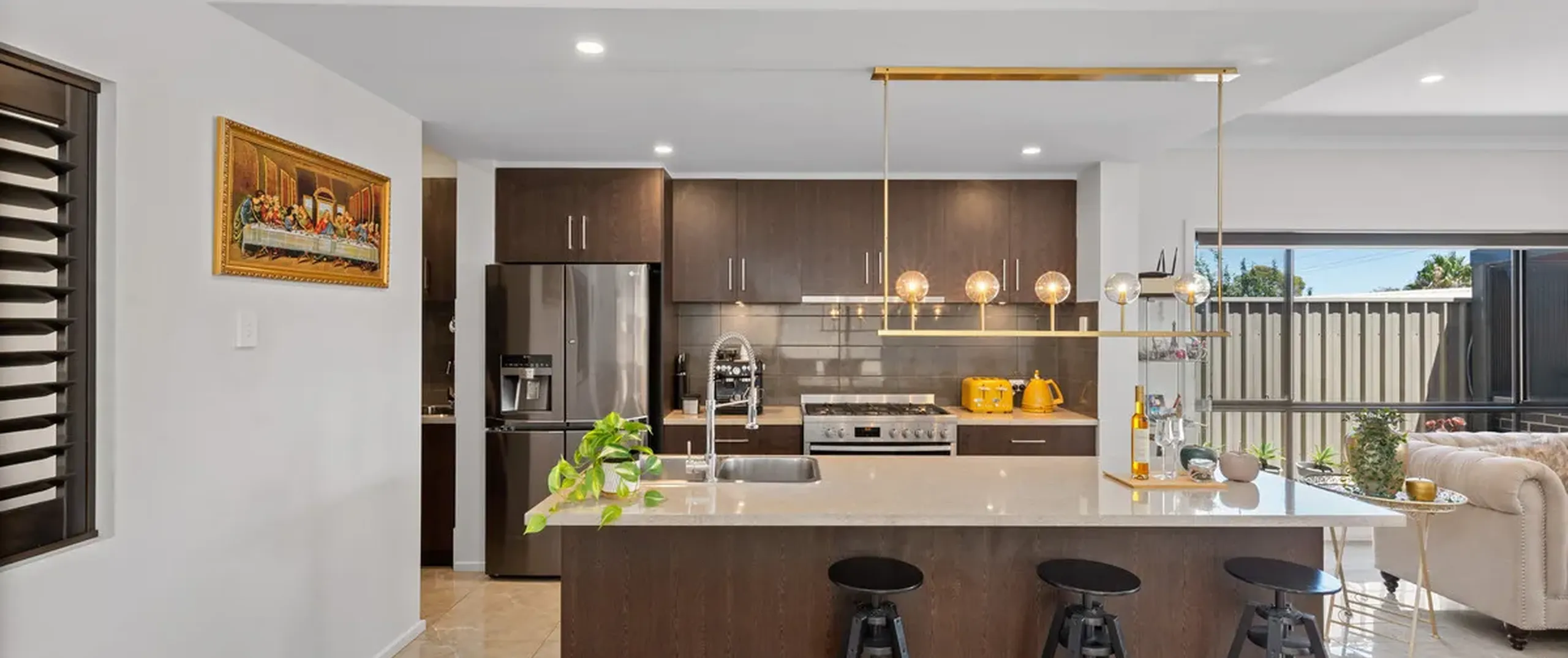 - Stylish kitchen with stainless steel dishwasher and standalone gas cooktop and oven, walk-in pantry, ample cupboard space, island bench with breakfast bar complemented by feature pendant lighting