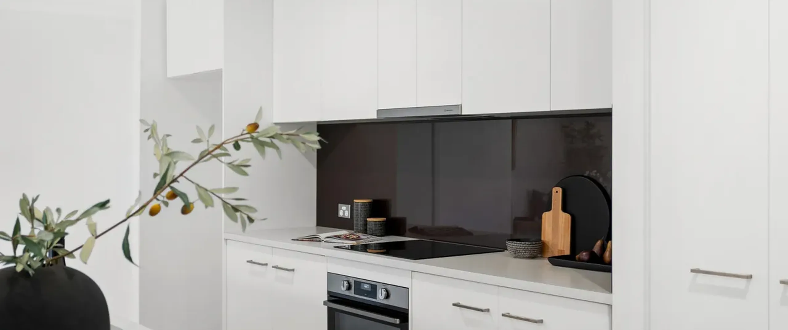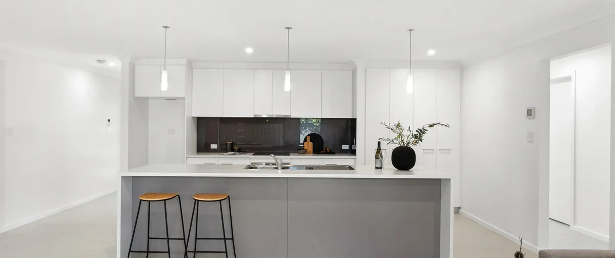 - Modern kitchen featuring a wide island and breakfast bar plus a trendy splashback including a suite of stainless appliances from Westinghouse, Fisher & Paykel dishdrawer, complete with ample cupboard space