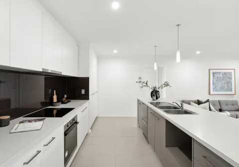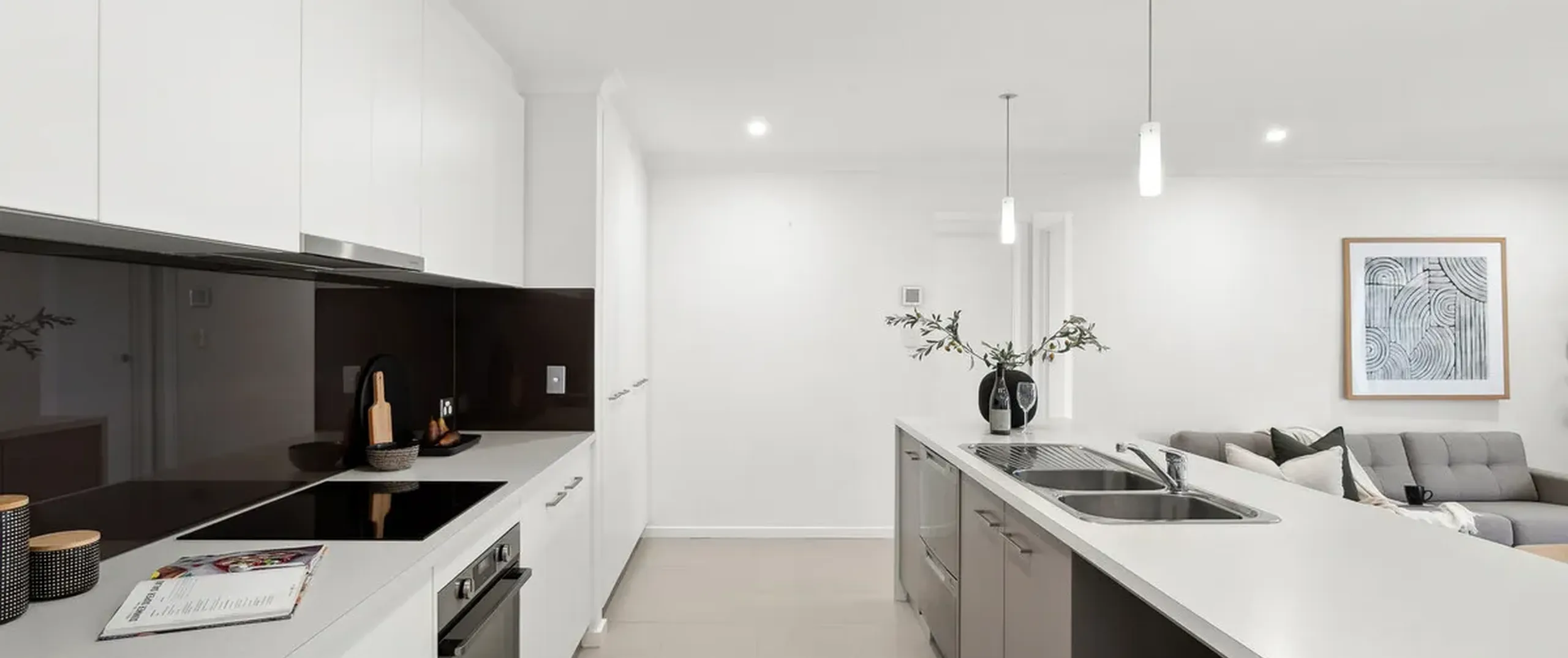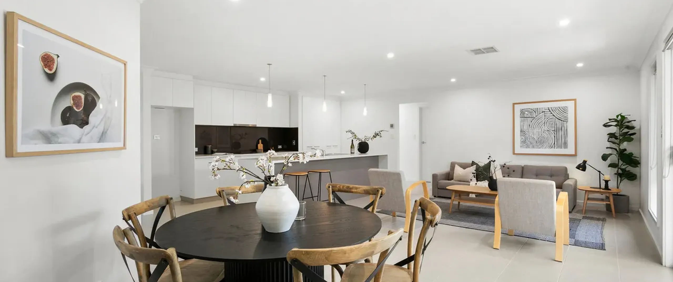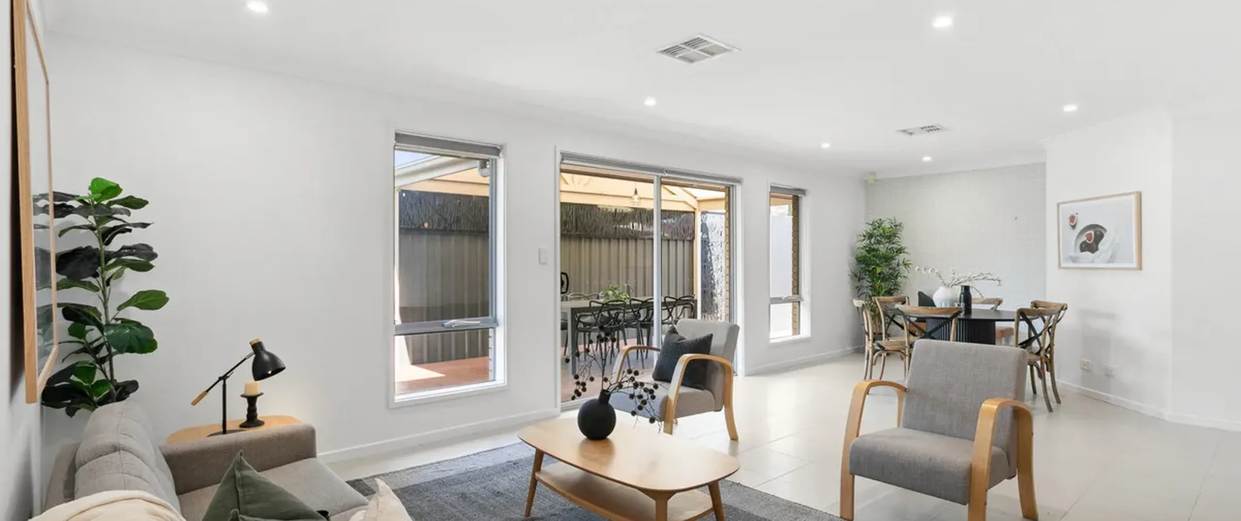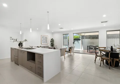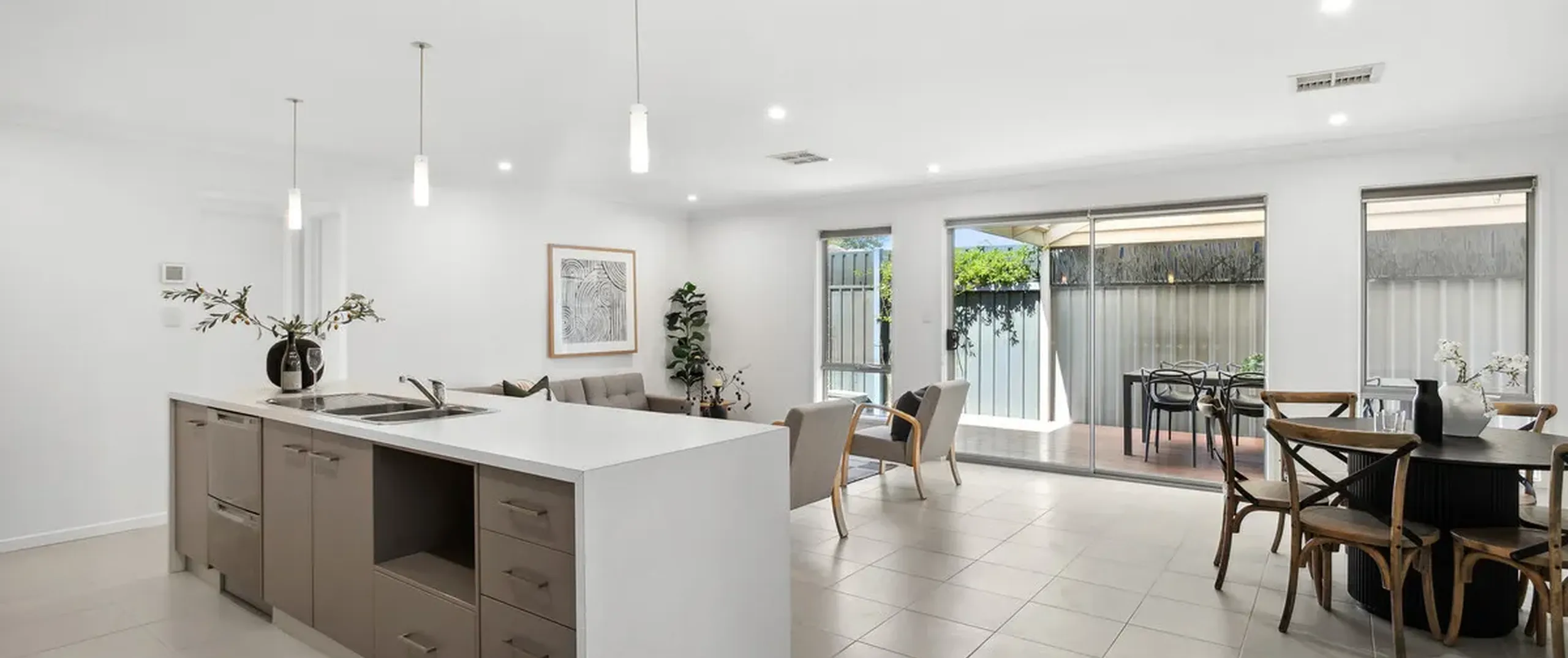 - Stunning open plan living, kitchen and dining area featuring downlights with glass sliding