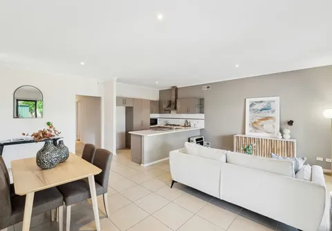 At the heart of the home, a spacious open-plan living and dining area invites natural light and year-round comfort, enhanced by a split-system air conditioner. The adjoining modern kitchen is both practical and stylish, featuring an island bench, gas cooktop, and ample storage—perfect for creating delicious meals and memories.