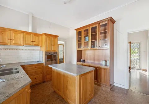 - Kitchen with timber cabinetry, built in island bench, electric cooktop, stainless steel oven and ample cupboard space