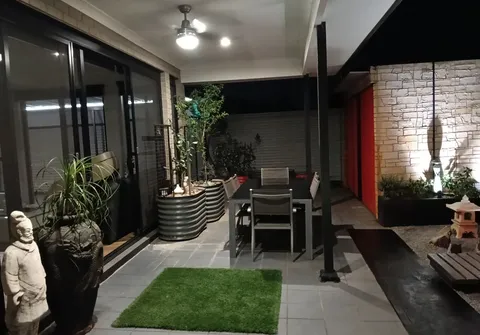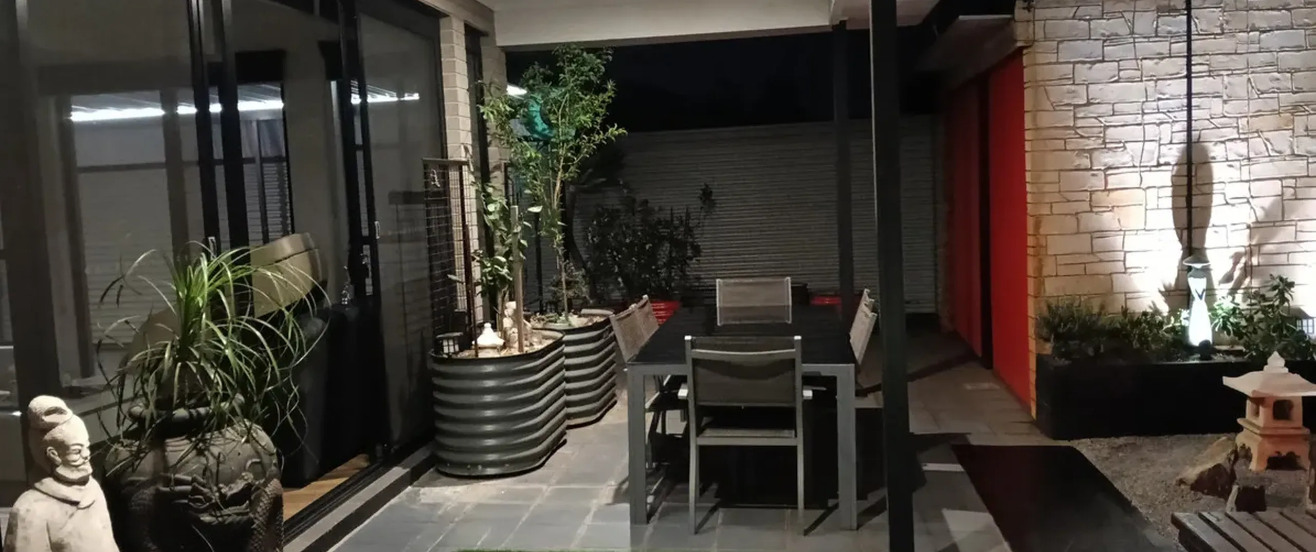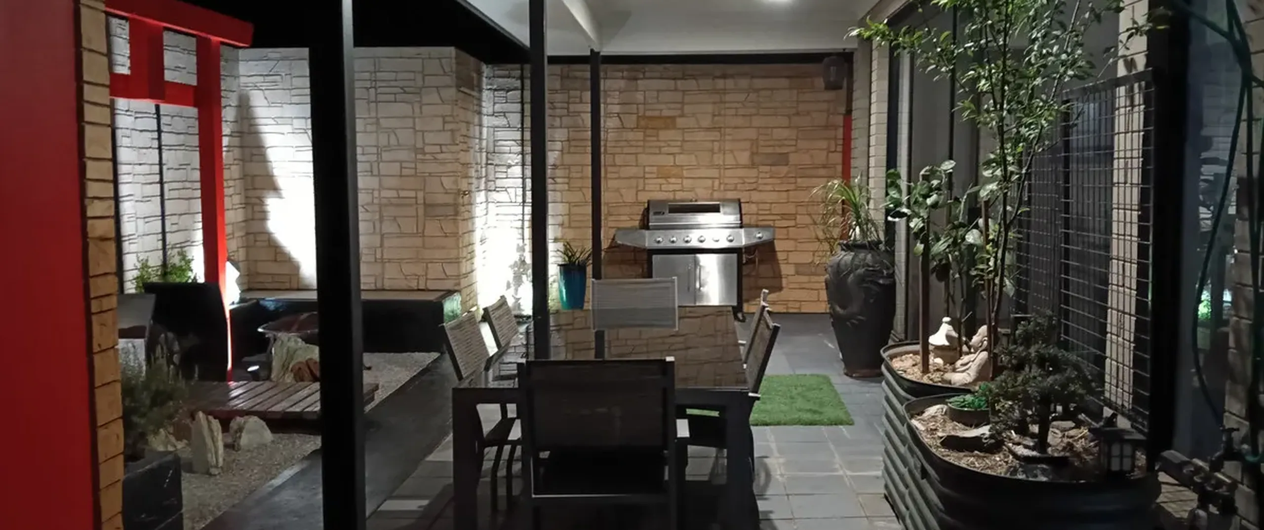 - Paved side verandah with ceiling fan, overlooking a serene Zen garden, with a space for a firepit