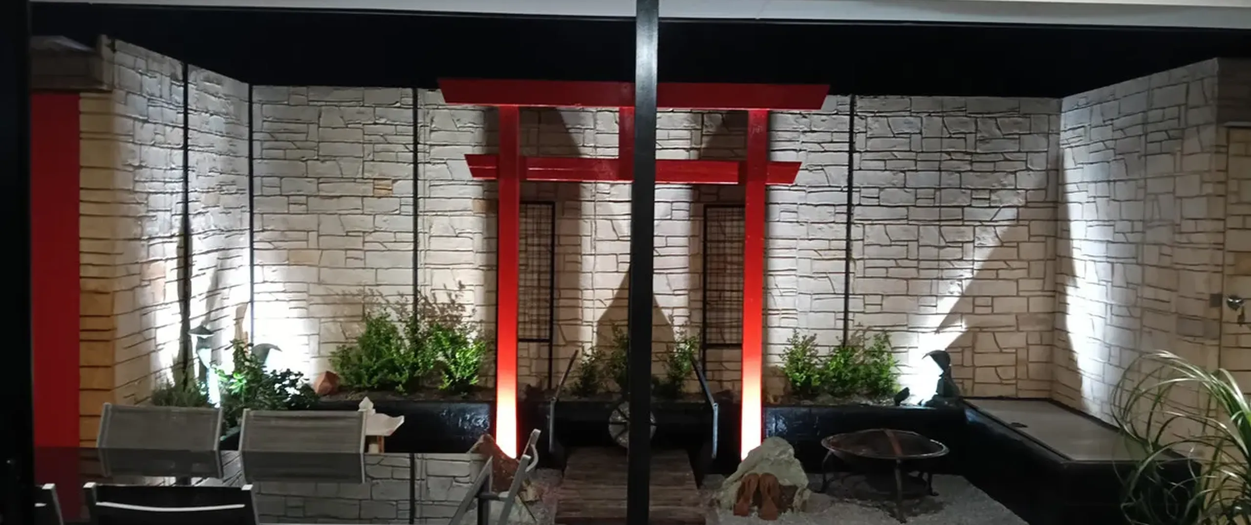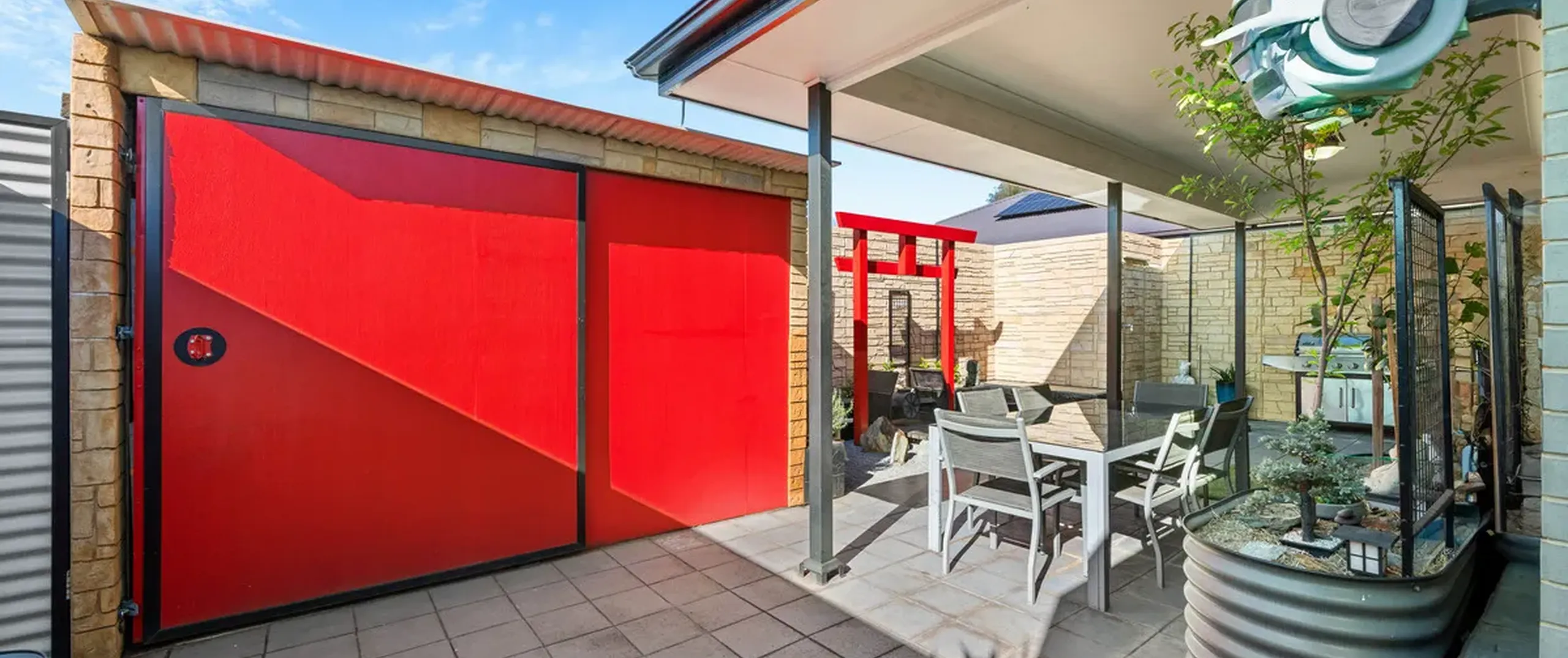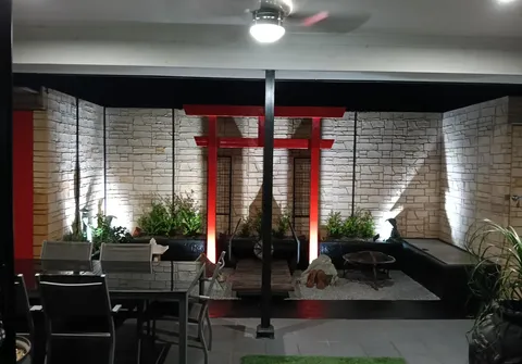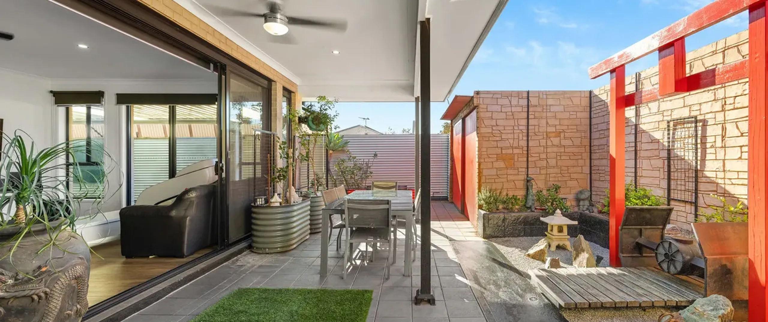 - Paved side verandah with ceiling fan, overlooking a serene Zen garden, with a space for a firepit