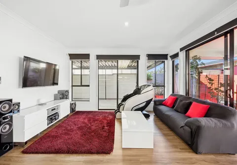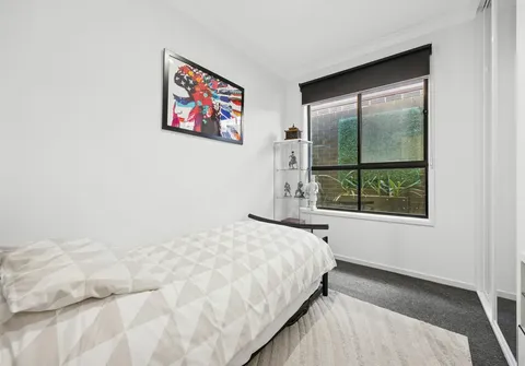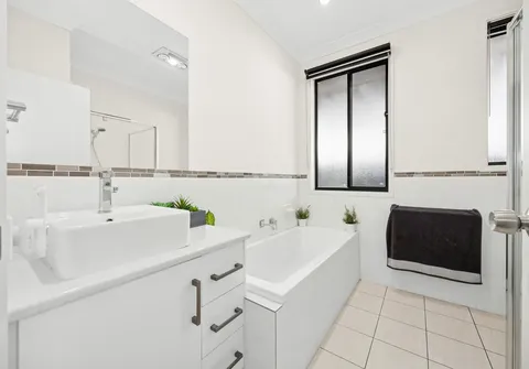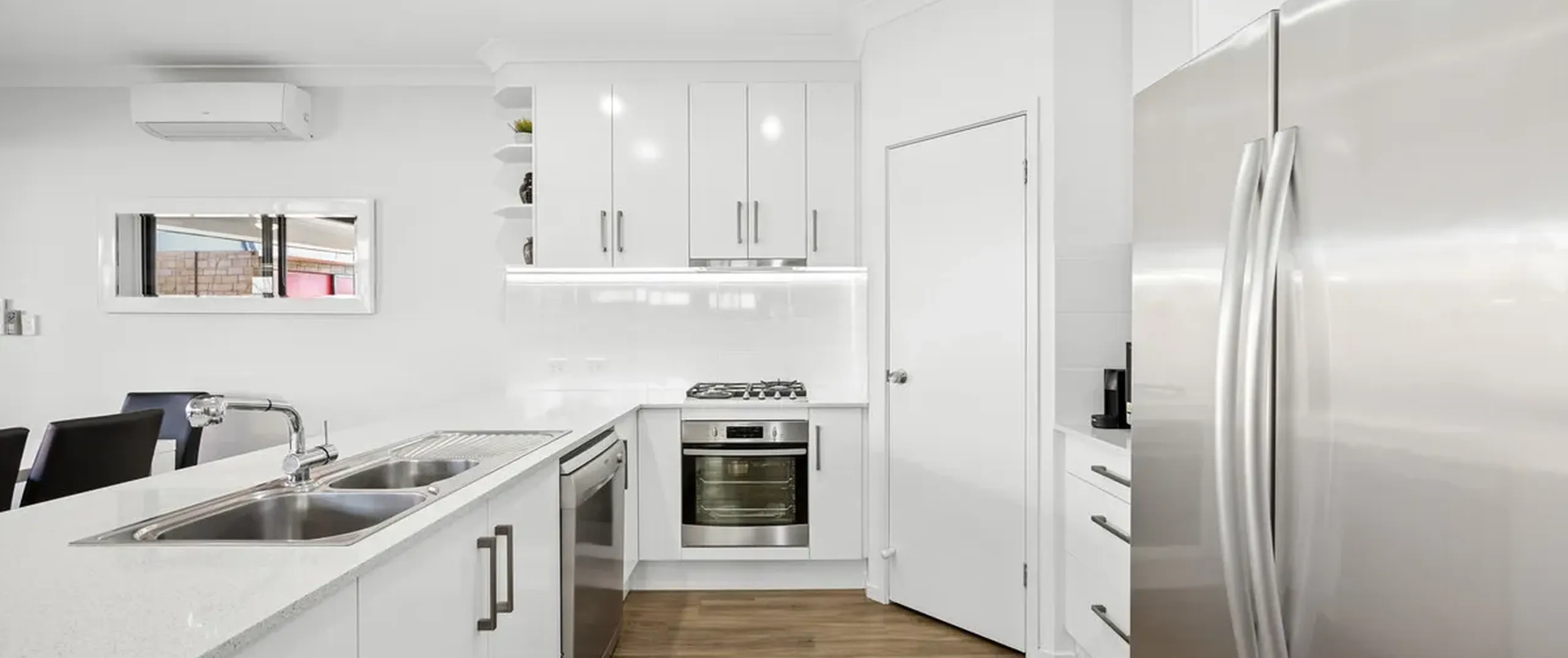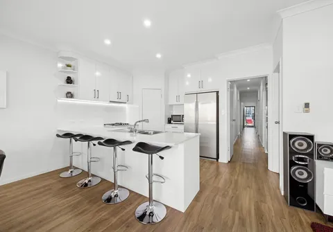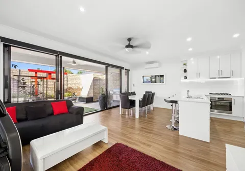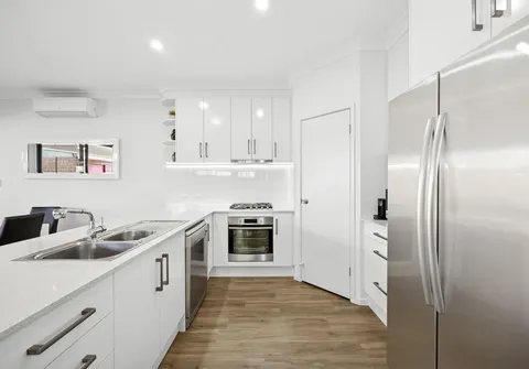 The heart of the home is the light-filled living, dining and kitchen area, perfect for family gatherings or casual entertaining. The contemporary white kitchen is both stylish and practical, featuring sleek benchtops, a stainless-steel gas cooktop, dishwasher and ample cupboard and bench space, making meal preparation effortless.