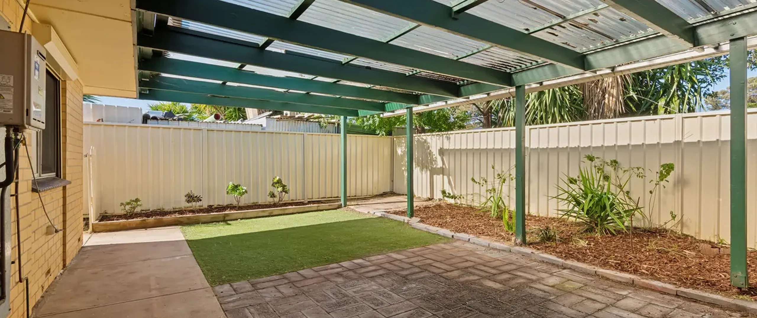 - Low-maintenance rear yard with artificial lawn, tidy garden beds and convenient side access