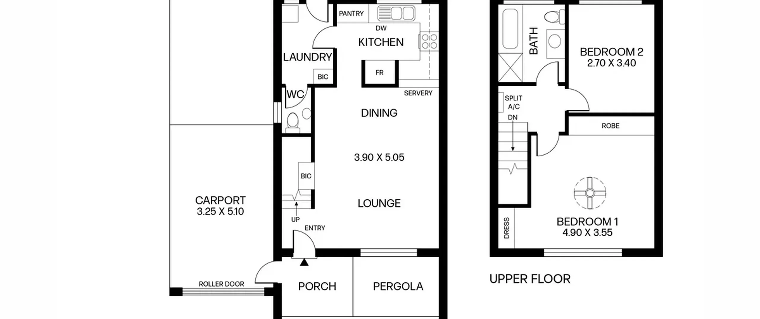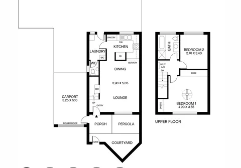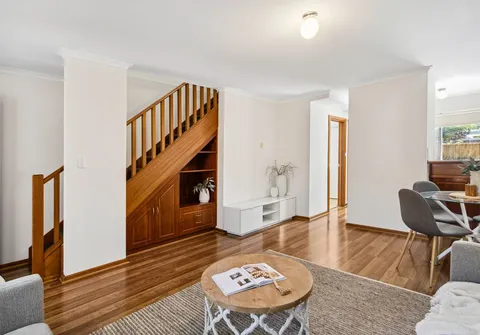 Stepping into a spacious open plan living and dining area, you'll find a seamless flow into the timber kitchen, enhanced by modern floating floorboards. Upstairs, two well-appointed bedrooms are serviced by a central bathroom. Outside, a spacious paved courtyard and garden provide a private outdoor retreat. The home is complete with a separate laundry, an additional ground-level toilet and a secure carport.