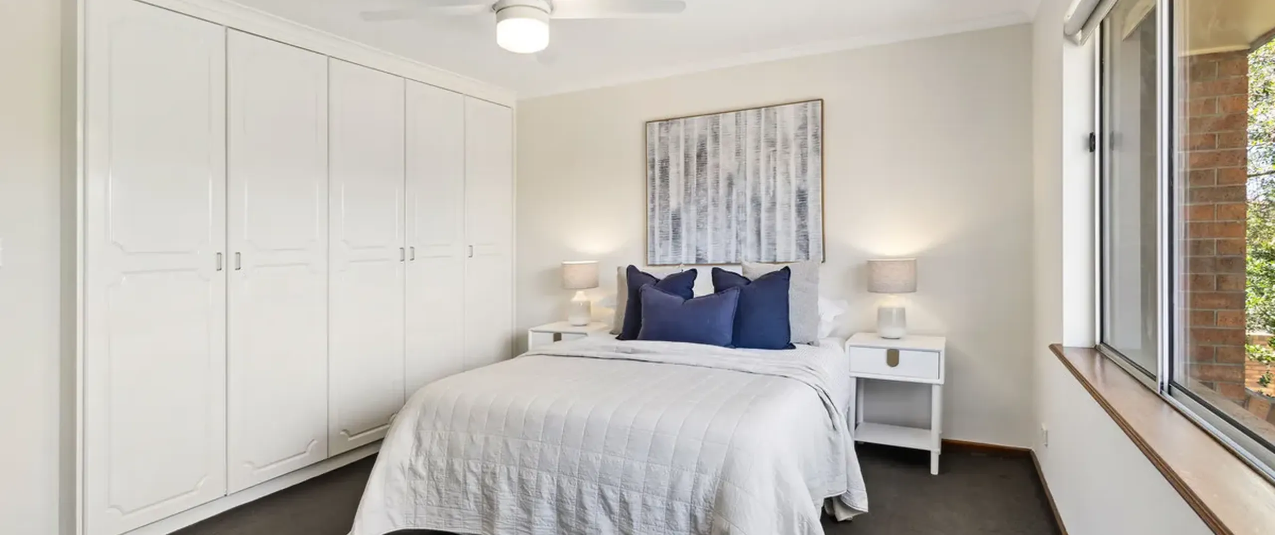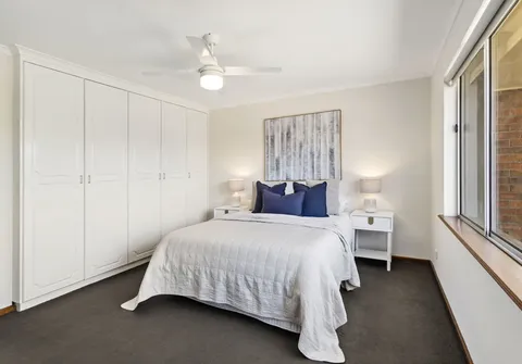 - Master bedroom with built-in robe, dresser and ceiling fan