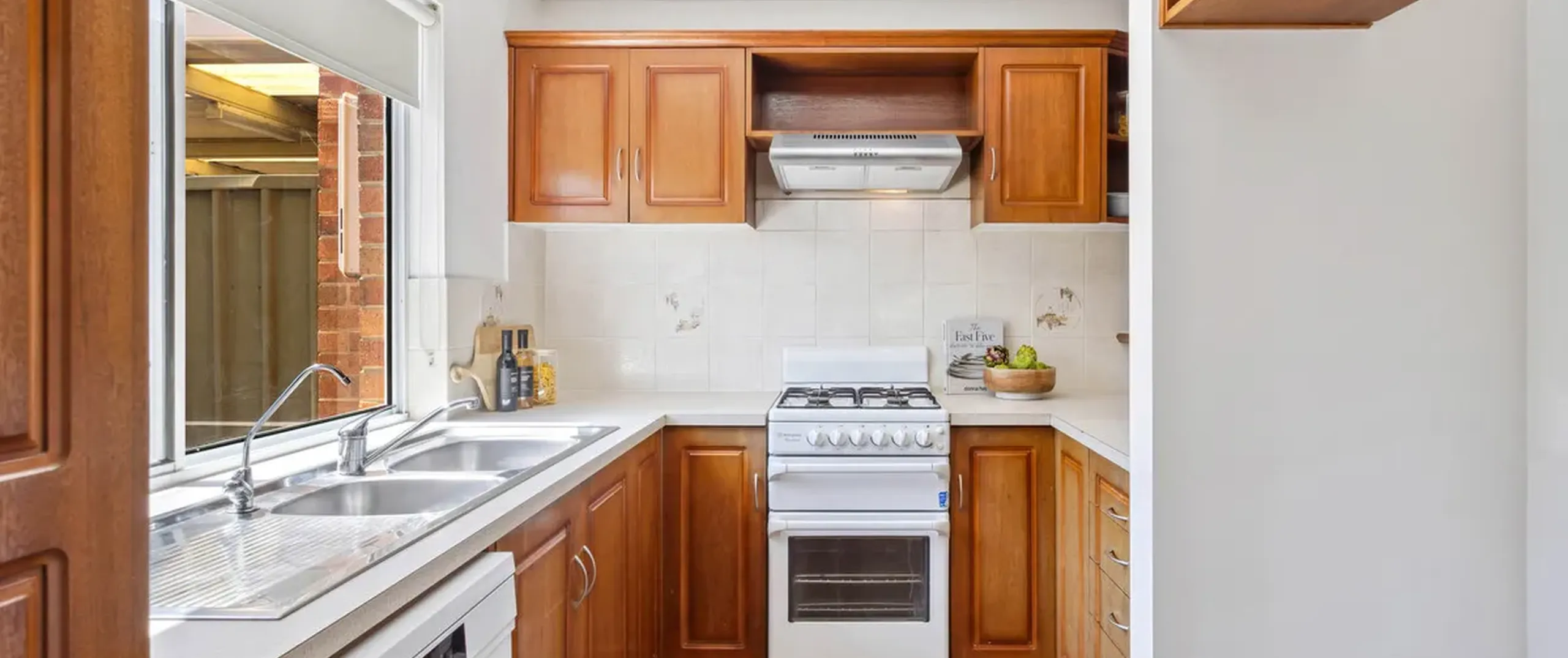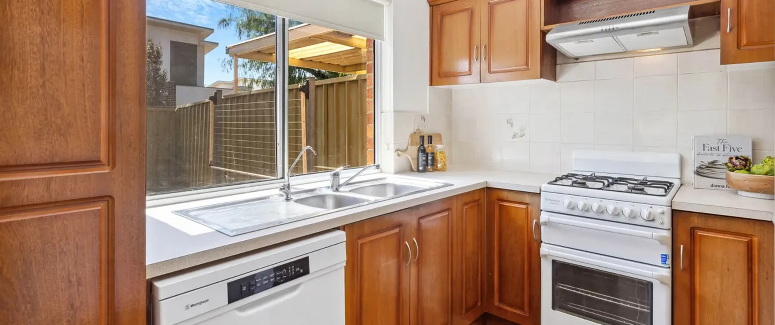 - Timber kitchen with gas cooktop, dishwasher and servery to dining